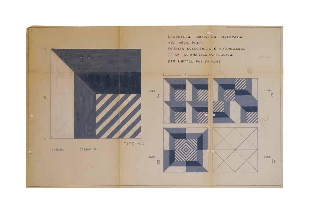 Il progetto di Gio Ponti per l’Hotel Parco dei Principi di Sorrento fa parte della storia dell’architettura italiana. Coinvolge tutto l’edificio e, in particolare, in collaborazione con la Ceramica D’Agostino, declina tutte le cento camere, così come la hall, la reception, il bar, il ristorante, con diversi decori bianchi e blu in ceramica, il tutto realizzato attraverso una serie di combinazioni “matematiche e geometriche” che portano a una serie completa di 27 disegni, riprodotte a mano, allora come ora, su maioliche 20×20 cm.