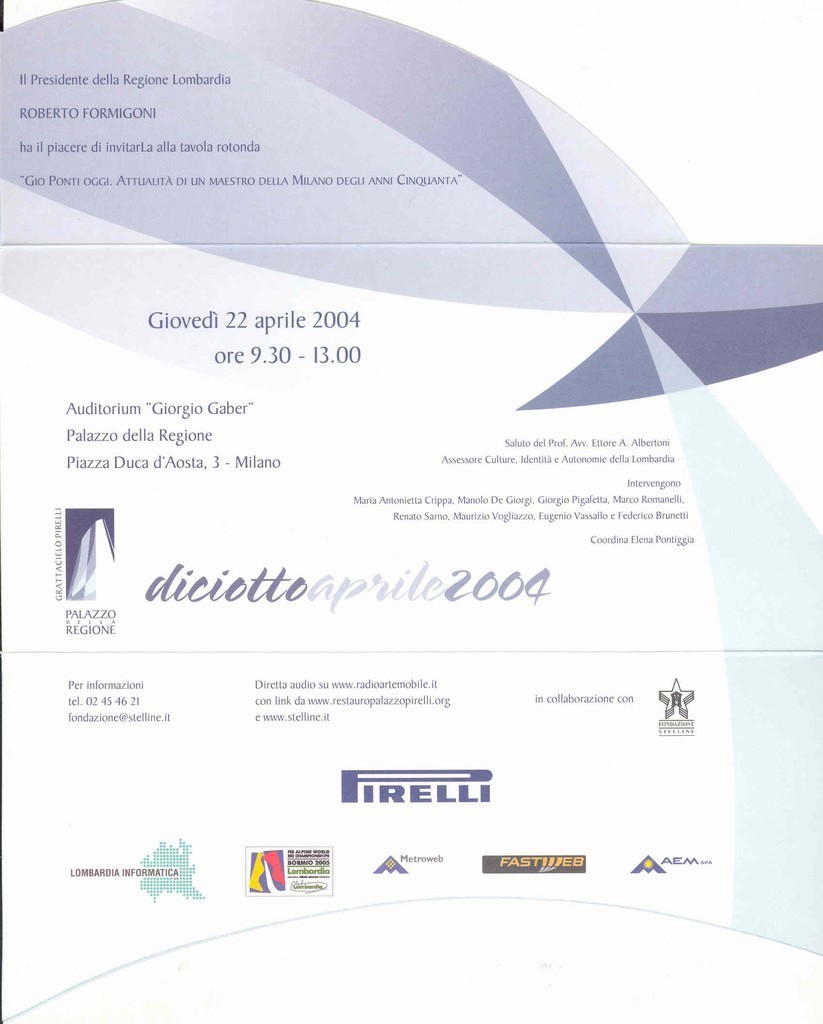 In occasione della settimana, dal 18 al 25 aprile 2004, dedicata all'inaugurazione del grattacielo Pirelli "ritrovato e rinnovato" dopo i tragici fatti del 18 aprile 2002, la Regione Lombardia, in collaborazione con la Fondazione Stelline, organizza presso l'Auditorium "Giorgio Gaber" la tavola rotonda " Gio Ponti oggi. Attualità di un maestro della Milano degli anni Cinquanta". L'incontro sarà dedicato alla presentazione della figura di Gio Ponti e al decisivo ruolo culturale architettonico e artistico che ha svolto nell'Italia del secondo dopoguerra. Si presterà particolare attenzione all'impegno del grande architetto nella città di Milano nonché nella costruzione del grattacielo Pirelli.
