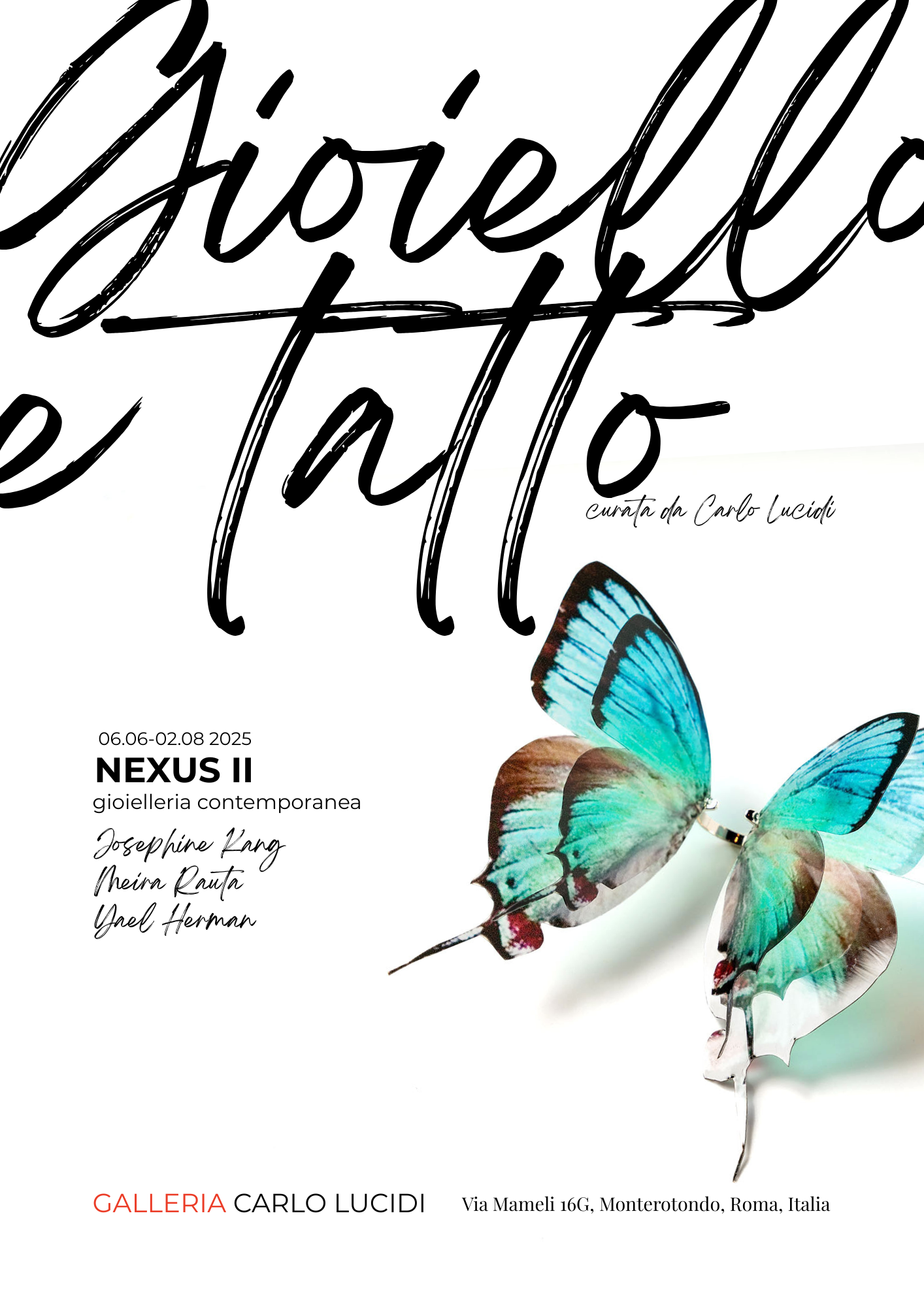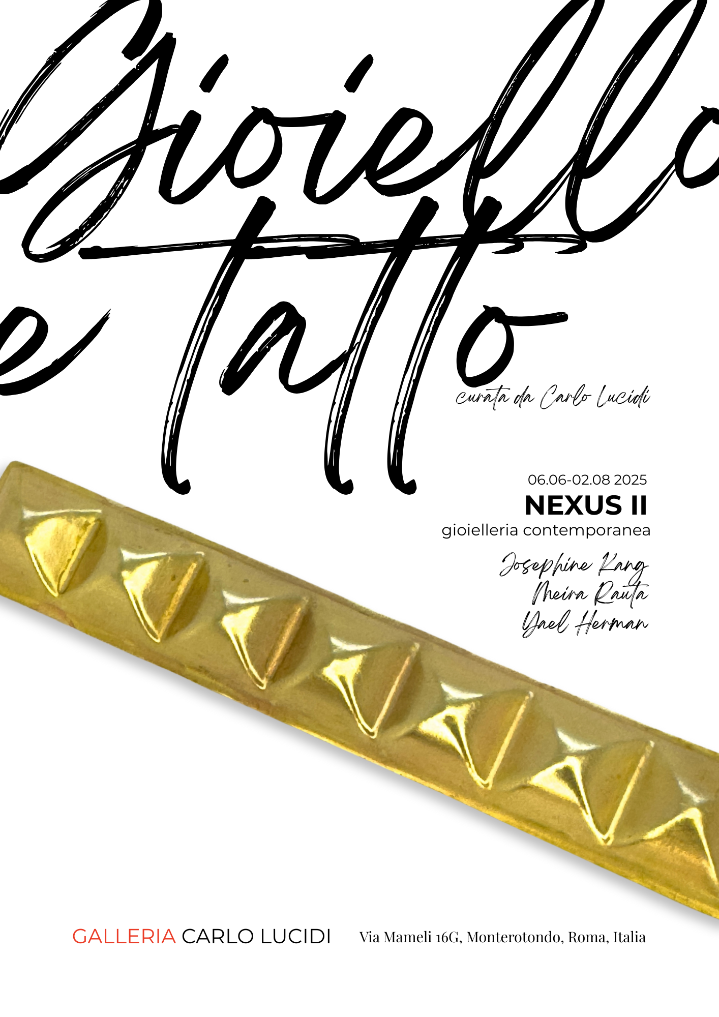 La Galleria Carlo Lucidi di Roma ospita dal 6 giugno al 2 agosto 2025 la mostra Nexus II: Gioiello e tatto. Curata dallo stesso artista ideatore del progetto, l'esposizione raccoglie 30 gioielli d’autore realizzati con metalli e materiali insoliti, reinterpretati in chiave contemporanea. Al centro di questa proposta curatoriale c’è l’idea di “nexus”: il legame profondo fra materia e forma, trasposto nel ruolo del tatto come senso primario per la percezione dell’opera. In questa prospettiva il gioiello non è solo un ornamento da ammirare, ma un oggetto che si fa toccare e che, al tempo stesso, tocca chi lo indossa, stimolando riflessioni sull’indossabilità, sull’emozione tattile e sulla costruzione dell’identità.