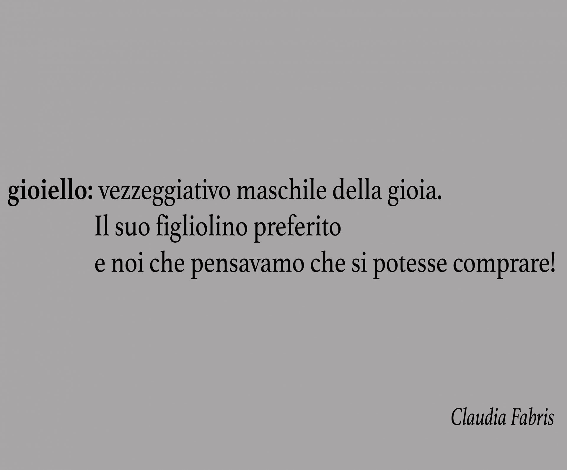 Durante le sue performance l’artista legge, “spiega” e “scompone” alcune parole lasciando agli ascoltatori un forte senso di stupore e un potente invito alla riflessione. Ha sviluppato per l’occasione dei pensieri sul tema del gioiello ma, come afferma la stessa Fabris, è da diverso tempo che medita su ciò che ci adorna: “anni fa scrissi che il Gioiello è il vezzeggiativo maschile della Gioia, il suo figliolino preferito. Perché davvero se non ce l'hai prima in corpo, comprarlo e indossarlo è solo una bugia”.