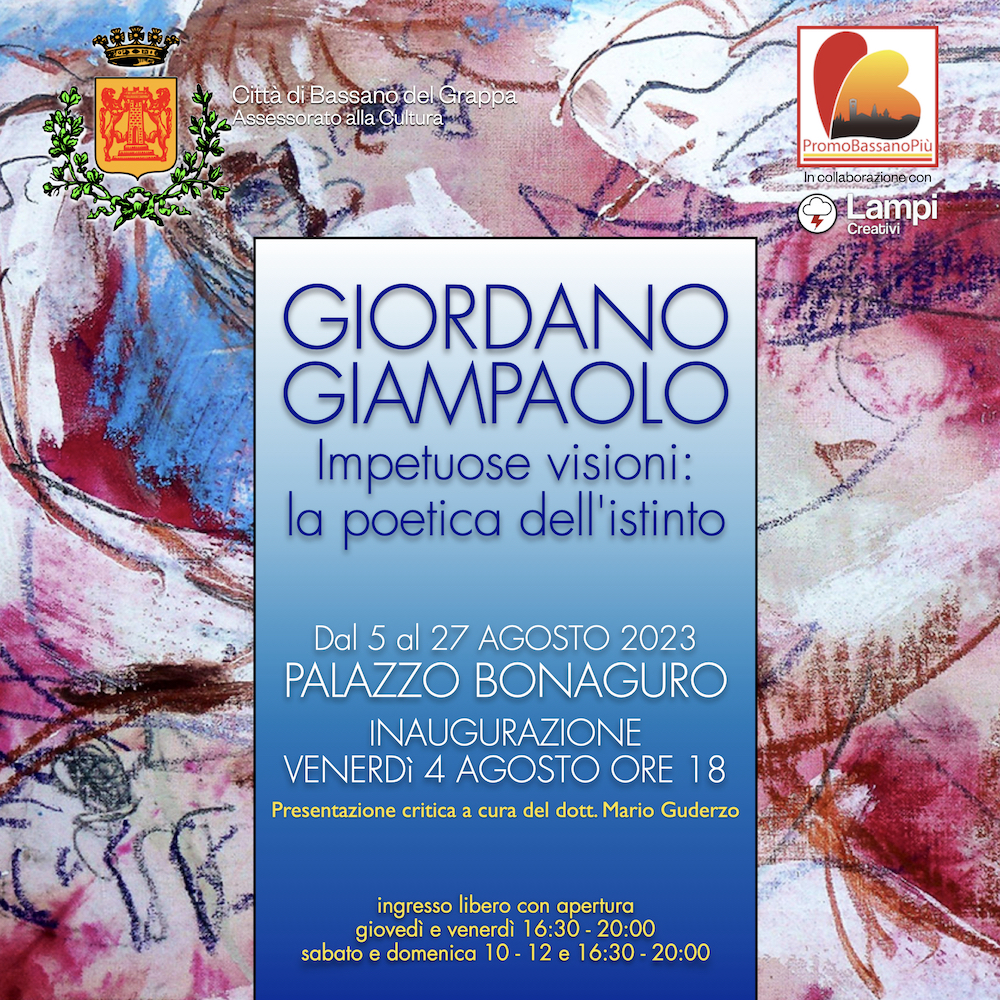 Si inaugura venerdì 4 agosto alle 18 la nuova mostra ospitata al piano nobile di Palazzo Bonaguro dal titolo “Giordano Giampaolo - Impetuose visioni: la poetica dell'istinto”: un'antologica per ripercorrere gli oltre cinquant'anni di espressione multidisciplinare dell'artista veneziano. L'Assessorato alla Cultura della città e l'associazione Promo Bassano Più danno così continuità alle proposte culturali che, da diversi mesi, si alternano nello storico edificio situato nella destra Brenta.