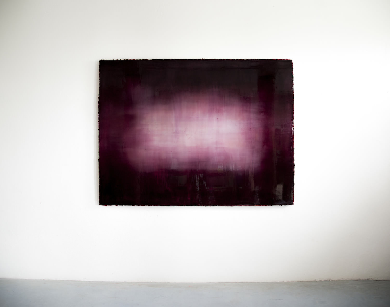 Il percorso espositivo continua nella sala centrale con la serie Silenzio Nudo, ispirata a un verso del poeta Giacomo Leopardi, e consistente in una straordinaria collezione di pannelli honeycomb dove le variazioni cromatiche del rosso sangue e del viola intendono recuperare, appunto, andando “a ritroso”, le primigenie istanze e manifestazioni della natura, proponendosi come una sorta di linguaggio umano che viene prima dei segni e della scrittura. Questi dipinti nascono dall’esplorazione dell’uso del silicone che, mischiato al colore su una base di più strati cromatici, dona profondità alle superfici senza l’utilizzo del chiaro scuro della pittura ma sfruttando la tecnica della sovrapposizione propria della scultura, dando così vita a una patina semitrasparente come un tessuto organico, che al tatto ricorda la morbidezza e l’elasticità della pelle.