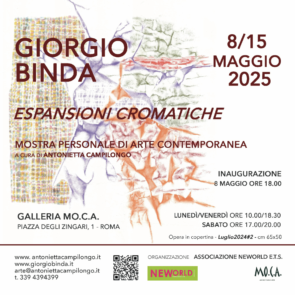 Nelle opere di Giorgio Binda sono costantemente presenti originali forme astratte, caratteristiche delle sue creazioni. Nel corso degli anni e delle sperimentazioni tali forme uniche si sono diversificate dando vita a separati percorsi creativi. Dal 2019 accanto ad opere astratte di forme, linee e colori troviamo monocromie nei toni del grigio e compressioni geometriche. Sono anche presenti in questo periodo opere di solo colore dove, successive stratificazioni cromatiche originano forme e suggestioni visive. Nelle opere più recenti; jungle scenes, mistic eyes, l'infinito, agosto 2024, luglio 2024 emergono innovazioni e mescolanze di stili e linguaggi, oltre a contaminazioni, citazioni e utilizzo di tecniche inedite. Tali elementi si discostano decisamente dalle tipicità dell'astrattismo iniziale, per approdare ad appartenenze ed eclettismi maggiormente rivolti all'arte contemporanea. In questo ambito creativo sono anche rappresentati temi e riflessioni su temi sociali; come nell'opera l'infinito dove, tramite la lirica leopardiana vengono indotte riflessioni legate all'ambiente. Nelle sale dell'esposizione entrambe le tematiche dell'astrattismo e dell'arte contemporanea sono rappresentate. I due percorsi opportunamente separati realizzano la partecipazione immersiva del visitatore. Altra particolarità della produzione esposta, degna di citazione, riguarda la rappresentazione in forma di dittico di quasi tutte le opere. Tale modalità consente di amplificare e rafforzare la narrazione visiva. Per volontà dell'autore sono anche presenti nella mostra schizzi e bozzetti vari realizzati in tempi non recenti, rappresentativi del percorso artistico/evolutivo.