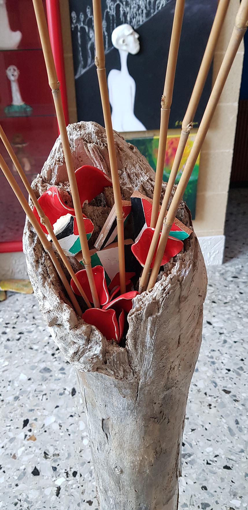 Alla base dei fuscelli compaiono delle lacrime di sangue in ceramica, emblema del dolore e delle sofferenze umane, contrapposte ai colori vivi e gioiosi dell’iride: una dicotomia che esprime il dramma e al tempo stesso la possibilità di redenzione.