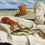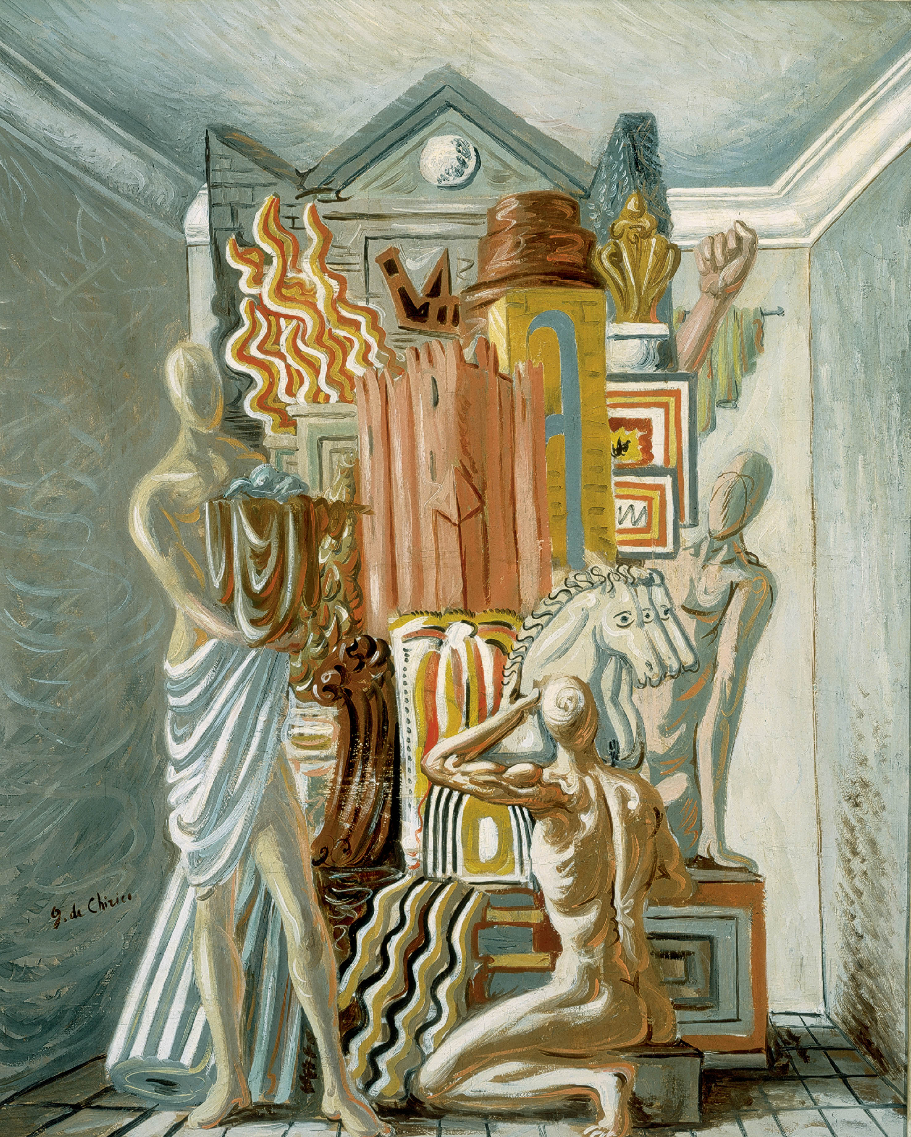 Come accertato, il pittore si accostò al Classicismo in maniera evidente dal 1919 al 1925: lo si evince dalla formidabile Lucrezia, 1921 circa, dall’Autoritratto con la madre, 1922, e dall’Autoritratto, 1925 – la prima opera dechirichiana acquistata dallo Stato Italiano – dai quali traspare evidente la sua conoscenza e il rispetto profondo per la pittura italiana del Quattrocento. L’elemento della sua continuità dell’opera metafisica degli anni Dieci, da lungo denominata come una “metafisica continua”, è illustrata, ad esempio, da Natura morta con cocomero e corazza, 1922, L’aragosta (Natura morta con aragosta e calco), 1922, o La mia camera nell’Olimpo, 1927, dove, in un’atmosfera fantastica ed enigmatica, compaiono, uno accanto all’altro, oggetti accostati apparentemente in maniera casuale. Oppure i Facitori di Trofei (1926-1928), una chiara evoluzione del primo periodo metafisico di de Chirico, in cui convivono elementi del passato e del presente: figure antiche, frammenti di colonne, fiamme stilizzate, profili di cavalli, il timpano di un edificio classico, fusi insieme da tre personaggi-manichino intenti nella costruzione dell’iconico “totem-trofeo”. Inoltre, opere come Tempio in una stanza e La famiglia del pittore, entrambi del 1926, o Thèbes, 1928, illustrano lo sviluppo innovativo di certi temi e soggetti degli anni Dieci come gli ‘Interni ferraresi’ e i ‘Manichini’.