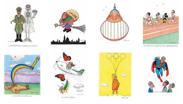 Tra le installazioni: un suggestivo teatrino tratto da una famosissima vignetta del 1987; tutti appesi, i piu' famosi personaggi che Forattini ha disegnato appesi a testa in giu'; la pietas di Forattini, le immagini piu' poetiche a memoria dei personaggi già scomparsi da lui trattati (un esempio: la bellissima immagine di Berlinguer di spalle, con il volto rivolto verso il mare, i lunghi capelli mossi dal vento a mo' di bandiera con falce, martello e la stella in volo verso il cielo).