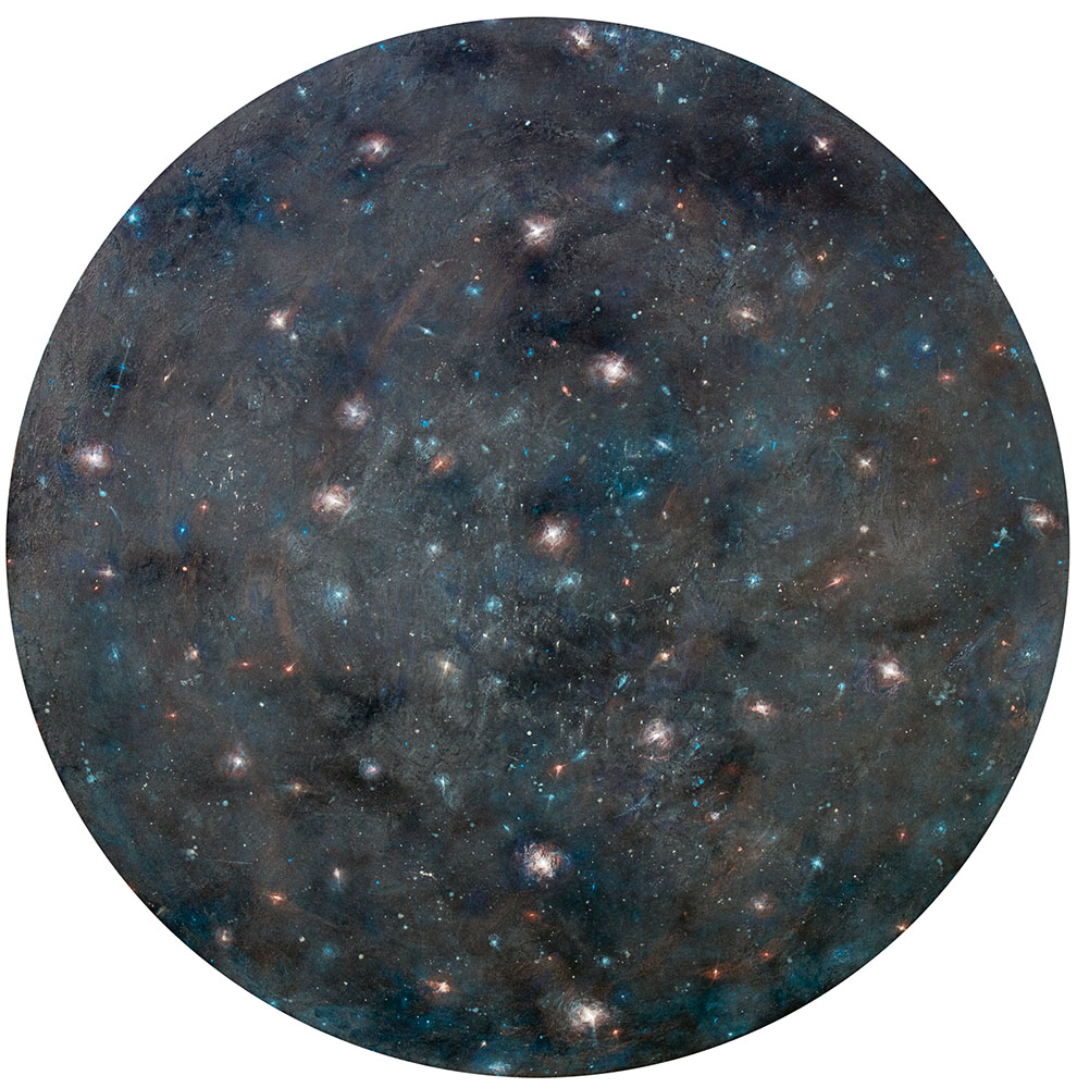 Queste regioni, dapprima avviluppate nel ventre selvatico dell’ecumene nella Roma degli imperatori, sono divenute arterie ineludibili nel Grand Tour che, a partire dal XVII secolo, indirizzava giovani aristocratici e paesaggisti europei verso i monumenti insigni, le identità sociali, i complessi culturali sedimentati nella morfologia profonda della civiltà occidentale, dalla cui scoperta sarebbe scaturita una piena maturazione intellettuale e artistica. Il calore suadente che pervade la nervatura della campagna affonda nella irrealtà aumentata di Galli sotto la forma di una radiazione corpuscolare, luce radente a irrorare il dispiegarsi controllato della materia – tempera e resina ecologica, gesso alabastrino, cere e pastelli – sulla referenzialità nulla del tamburato, rivestito da collages; la compattezza fisica del tramonto riverso sulle increspature delle acque lacustri si sublima sinteticamente a iperbole cromatica nelle estensioni varianti del rosso; il firmamento, mappa genetica di trapassati Odisseo nello spazio, si accende nella composizione orizzontale di un notturno per congiungere la prima fase dell’antropogenesi con l’ultimo spasmo del cybermondo, ignoto a quanti abbiano – nel grande viaggio – tentato di assoggettare l’indefinito. Ne emerge il carattere mistico di ambienti spiritualmente connotati, la speciale intimità della compenetrazione tra antiche pratiche di convivenza sociale e ricerca dell’agnizione del sacro (una “alterità” rispetto al comune-profano) le cui tracce permangono inscritte nella memoria dura degli artefatti prima, del campo visivo e del territorio pittorico dopo.