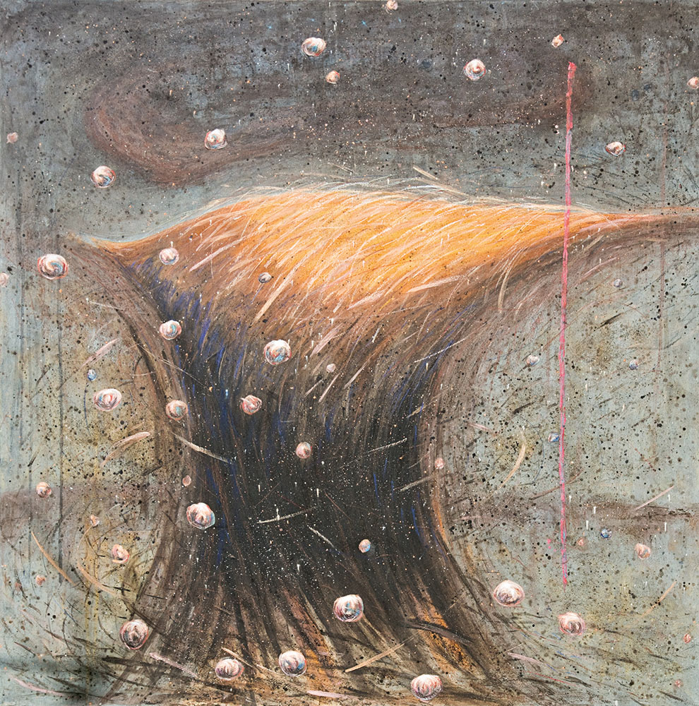These regions, at first enveloped in the wild womb of the ecumenism in the Rome of the emperors, became unavoidable arteries of the Grand Tour which, starting from the seventeenth century, directed young European aristocrats and landscape architects towards distinguished monuments, social identities, sedimented cultural complexes in the deep morphology of Western civilization, the discovery of which would have resulted in a full intellectual and artistic maturity. The persuasive heat that pervades the veining of the countryside sinks into the increased unreality of Galli, in the form of a corpuscular radiation, a brushing light that bedews the controlled unfolding of the material - tempera and ecological resin, alabaster plaster, waxes and pastels - on the null reference of the panelling, covered with collages; the physical compactness of the sunset over the ripples of the lake waters is synthetically sublimated to chromatic hyperbole in the varying extensions of red; the firmament, the genetic map of the remote past of Odysseus in space, lights up in the horizontal composition of a nocturnal connecting the first phase of anthropogenesis with the last spasm of the cyberworld, unknown to those who - in the great journey - have tried to subdue the indefinite. The mystical character of spiritually connoted environments emerges, the special intimacy of the interpenetration between ancient practices of social coexistence and the search for the recognition of the sacred (an "otherness" compared to the common-profane) whose traces remain inscribed firstly in the hard memory of the artefacts, and afterwards in the visual field and pictorial territory.
