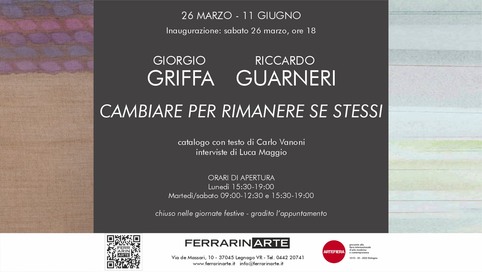 La Galleria FerrarinArte di Legnago (VR) presenta una doppia personale dedicata agli artisti Giorgio Griffa e Riccardo Guarneri, esponenti di spicco della Pittura Analitica. Catalogo con testo di Carlo Vanoni e interviste di Luca Maggio.