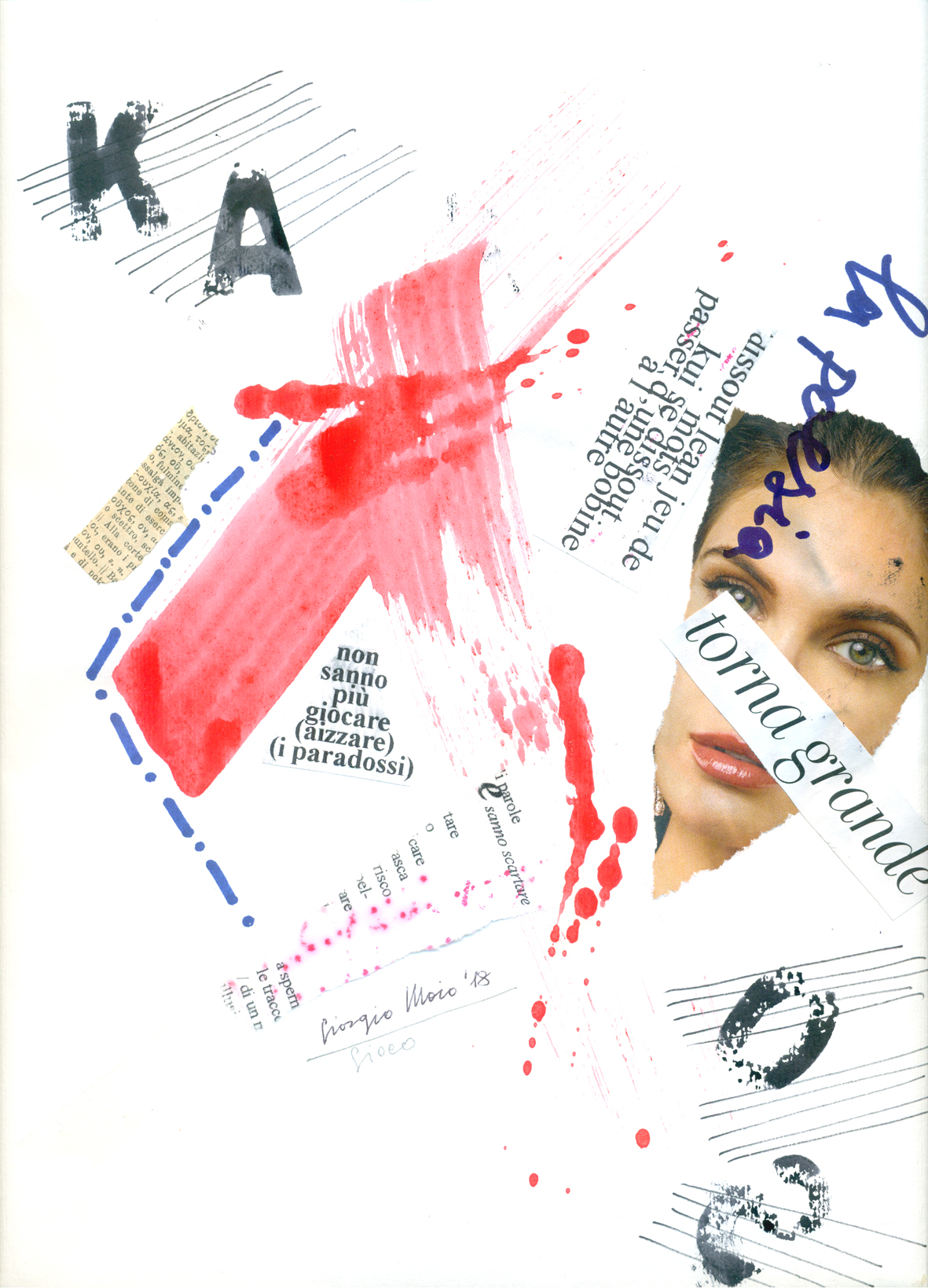 “Kaos è il titolo scelto dall’autore per questa esposizione, e in questo caos poietico , si può leggere, credo, la cifra della dimensione politica della poesia di Moio, che, raramente dichiarata expressis verbis in questa produzione visuale, risiederebbe proprio nell’irrefrenabile volontà sperimentale, un segno ultimo, come estrema difesa di fronte ad un sistema rispetto al quale, storicamente, la poesia visiva si è sempre posta in termini risolutamente antagonisti. Un avvolgersi su sé stessa della scrittura ed implodere, per poi esplodere ancora, che sta per un rifiuto irrimediabile dell’esistente.” Ci avverte Carlo Bugli, che con Giorgio Moio ha condiviso per lungo tempo progetti ed attività creativa.