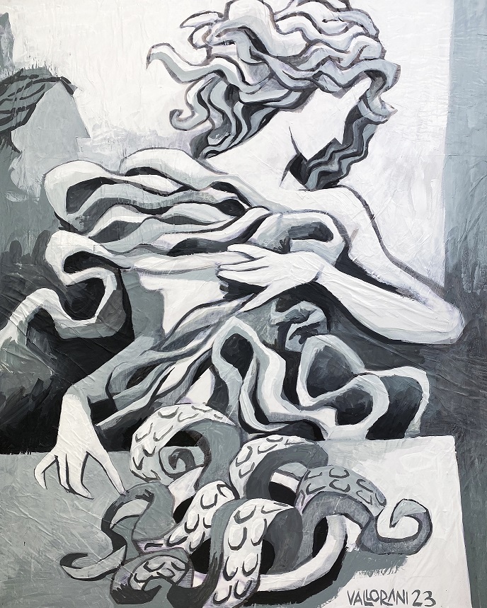 Digital painting, pittura tradizionale, disegno, collage, mosaico: sul supporto dell’opera realizzata da Giorgio Vallorani vengono a interagire il classico con il contemporaneo, senza provocare cortocircuiti o contrasti, generando invece nuove opportunità percettive.