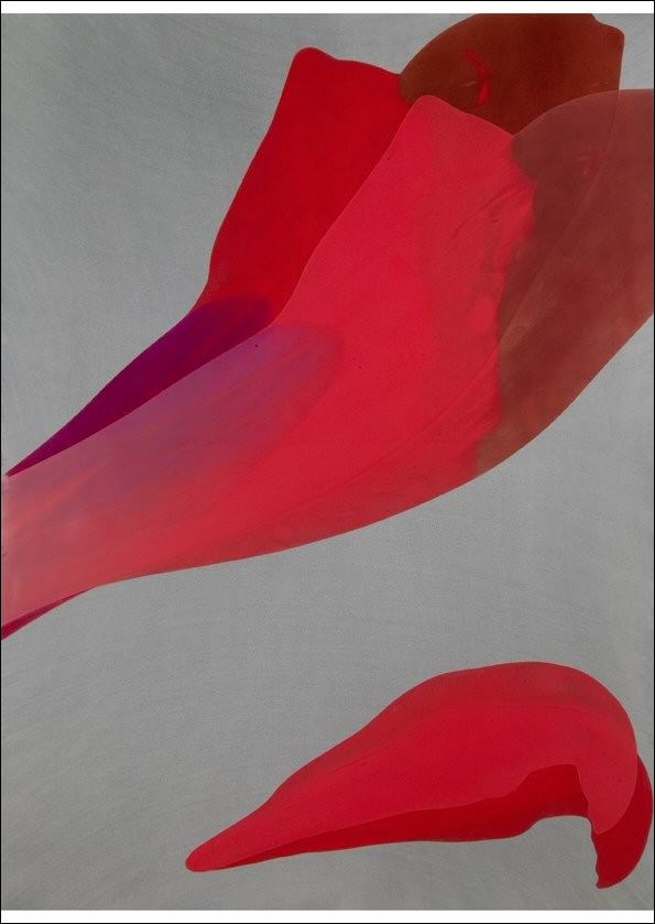 Il procedimento è sempre lo stesso. Dopo aver steso del colore acrilico tra due valve di polifoil, le chiude facendole aderire, quindi distribuisce il colore seguendo un bozzetto precedentemente preparato. Separate le due valve di polifoil, dopo averle fatte asciugare, ritaglia le forme-colore che si sono così ottenute. A questo punto le applica su tela (un supporto cui ritorna ora dopo aver utilizzato per anni quasi esclusivamente legno e lastre di zinco) componendole, sovrapponendole, associandole in modo che le forme trovino un significato e una risonanza nello spazio pittorico. A questo punto il lavoro si risolve in una sintesi visiva, in guizzi quasi inconsapevoli cui però l’artista dà struttura attraverso delle fasce bianche, nere o rosse che contengono, comprimono, imbrigliano l’esuberante espansione del colore, il suo flusso emozionale. In questo modo la forma-colore, estrapolata dal suo contesto originario, vive di vita autonoma e crea nuovi, inaspettati campi di forza che finiscono per armonizzarsi o entrare in conflitto. L’opera oscilla tra le polarità di segno-colore, lucido-opaco, tela-polifoil. Due petali di rosso porpora divorano il grigio della superficie. Sfumature di lilla e carminio, di gusto pop, fuse in un abbraccio, rimandano alle serigrafie di Andy Warhol. L’incontro mistico di nero e rosso sangue sta a evocare la crocifissione. Un viola da Secessione austriaca, che sarebbe piaciuto a Klimt, dilaga sulla tela unendosi ai bruni. Altrove Vicentini si affida all’autorità del nero, denso e sporco, potente e polisenso, che è già in sé tante cose: la melanconia, l’evocazione di Goya e della grafica dell’espressionismo europeo, o la fuliggine dell’inquinamento urbano. Uno dei lavori più recenti è invece una tela di sapore antico, basata su accordi tonali preziosi. Ma è sempre e comunque il colore crudo, puro e denso a costruire forma, luce e ombra in una composizione che non rispecchia più il dato naturale, ma la sua trasfigurazione nella visione mentale dell’artista.