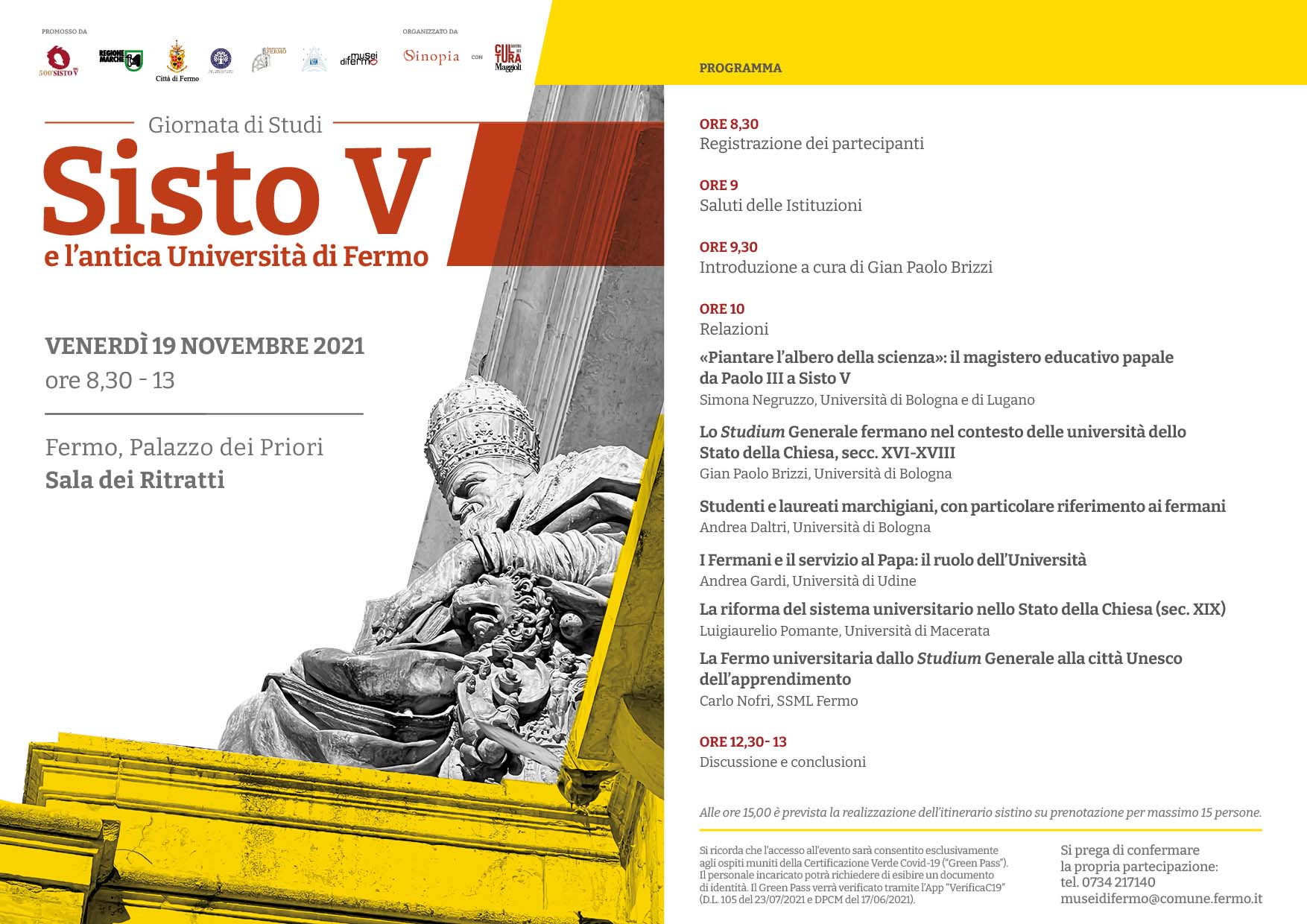 Venerdì 19 novembre 2021 si terrà a Fermo, nella Sala del ritratti di Palazzo dei Priori, la giornata di studi “Sisto V e l’antica Università di Fermo", nell’ambito delle celebrazioni del V centenario della nascita di papa Sisto V. Il convegno è centrato sul ruolo svolto dal Pontefice nella storia dell’Università fermana. Durante il papato di Sisto V, infatti, che con bolla del 1585 - anno stesso dell’ascesa al soglio pontificio - “restaurò” l’Università della città nella quale era stato vescovo, gli studi a Fermo vissero la loro stagione più fiorente, benché connotassero già da secoli la vita cittadina.