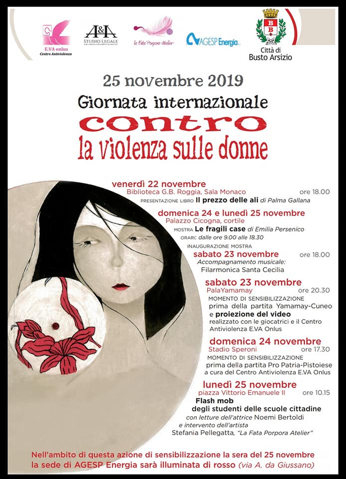 Il programma degli eventi, «la punteggiatura» della Giornata antiviolenza come l’ha definita l’assessore all’educazione Gigi Farioli, inizia già oggi pomeriggio, 22 novembre, alle 18 in sala Monaco con la presentazione del libro di Palma Gallana “Il prezzo delle ali”. Domani, 23 novembre, alle 18 nel cortile di palazzo Cicogna, con l’accompagnamento musicale della Filarmonica Santa Cecilia, verrà inaugurata la mostra “Le fragili case” di Emilia Persenico (visitabile domenica 24 e lunedì 25 dalle 9 alle 18.30). Chiusura in grande stile nella mattinata di lunedì 25 novembre alle 10.15 in piazza Vittorio Emanuele II: un flash mob con 700 ragazzi delle scuole superiori, insieme all’artista Stefania Pellegatta (La Fata Porpora) e con le letture dell’attrice diplomata all’Icma Noemi Bertoldi. Un nastro rosso legherà tutti i presenti, in una performance che «rimanda a Maria Lai», come rivela la vicesindaco e assessore alla cultura Manuela Maffioli. Infine, la sera di lunedì 25 novembre, la nuova sede di Agesp Energia nell’ex caserma della Finanza di via Alberto da Giussano verrà illuminata di rosso per sensibilizzare sulla Giornata contro la violenza.