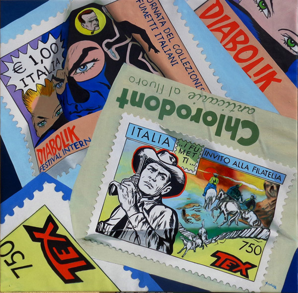 «Giovan Battista Rotella – scrive Boris Brollo, curatore della mostra – si è assunto di esser certificatore della memoria letterario-visiva, imponendo a tutti noi una storia meno eclatante, meno monumentale ma più intima e cioè il raccontare per francobolli, per lacerti di buste postali, il fluire dell'esistenza umana compresa fra cultura alta e cultura bassa. Egli si assume con la pittura il raccontare della vita e ne fa la sua storia. Non solo egli ricostruisce per noi una memoria visiva che raccoglie tutta la storia dell'arte citando Renoir, Warhol, Botero, Mirò, Picasso, Modigliani, Puccini, Manzoni, ma pure Tex Willer e Diabolik che sono la cultura “bassa”, quella più popolare, riscattandola così agli occhi stessi della storia, donandole vestigia artistiche inusuali, cioè portandola ad un vissuto culturale inaspettato per un fumetto che si fa pittura di grande valore».