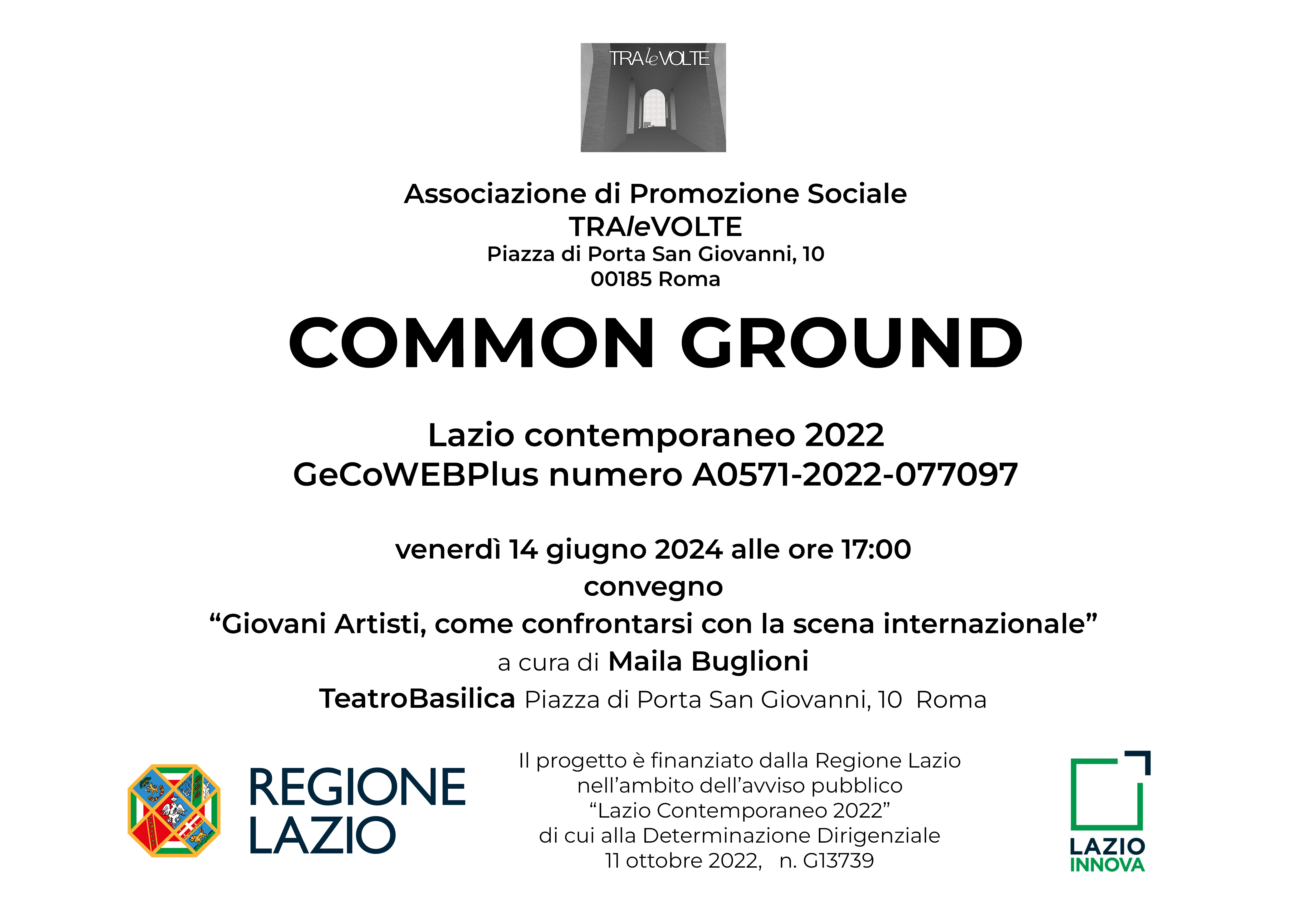 Il convegno segna la prima tappa del progetto COMMON GROUND e si pone lo scopo di rispondere alle domande e alle problematiche insite nell’attuale sistema dell’arte vigente nell’Italia e, in particolare, nella regione Lazio. La complessa situazione culturale presente nella nostra penisola, sottovalutando l’ambito del contemporaneo, ci invita a riflettere e a proporre un cambiamento di direzione chiamando le varie figure professionali coinvolte nel dibattito, ognuna con le proprie competenze, a curare la professionalità dei giovani artisti che s’interfacciano nel mondo del lavoro.