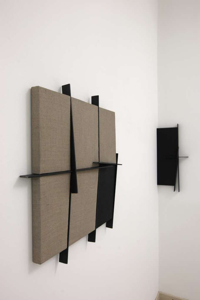 Così le lamine di ferro che si insinuano nella juta della tela, come a voler portare alla luce un nervo scoperto: una rottura dell’armonia e della sensibilità connessa all’esistere e all’esistente. I materiali e i loro volumi plastici stabiliscono infatti un “qui” e un “altrove”.