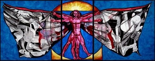Ecco che il dipinto di Picasso diventa un mantello, che protegge dal gelo delle stragi degli innocenti che oggi non possiamo far finta di non vedere: unico indumento che ripara e difende il vero senso di civiltà trasfigurandosi, ad un tempo, in ali potenti della LIBERTA' DELL'UOMO.
