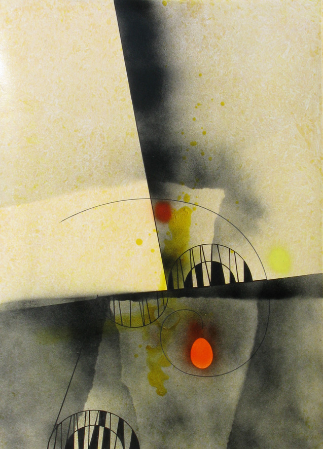 La linea obliqua appare anche nelle opere della serie “la nascita e la spirale”, finora mai esposte. Qui svolge la funzione di collegamento tra la materia e lo spirito. Lo spazio informe è riempito da particelle circolari o semi circolari, molecole che un giorno si aggregheranno per formare altre entità.