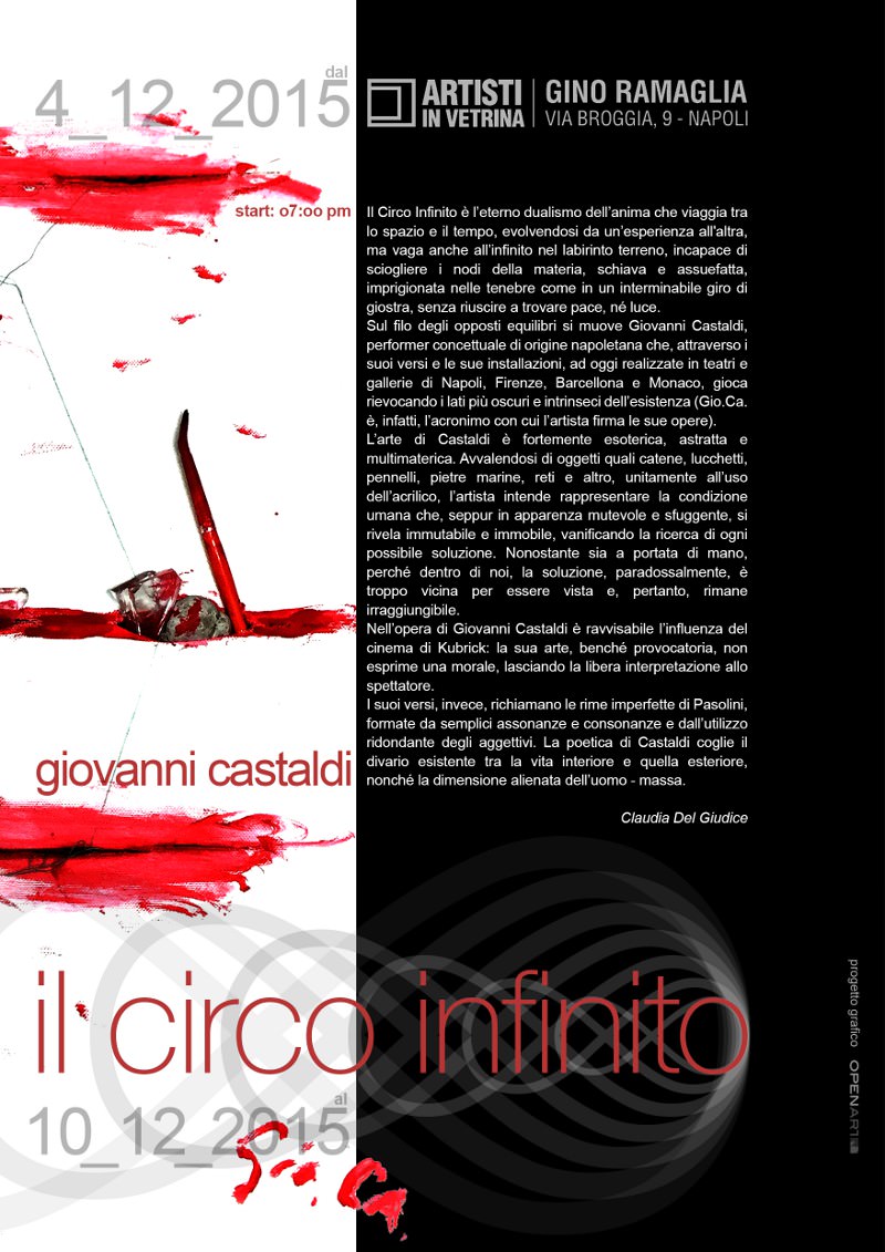 Sul filo degli opposti equilibri si muove Giovanni Castaldi, performer concettuale di origine napoletana che, attraverso i suoi versi e le sue installazioni, ad oggi realizzate in teatri e gallerie di Napoli, Firenze, Barcellona e Monaco, gioca rievocando i lati più oscuri e intrinseci dell’esistenza (Gio.Ca. è, infatti, l’acronimo con cui l’artista firma le sue opere).