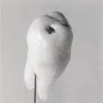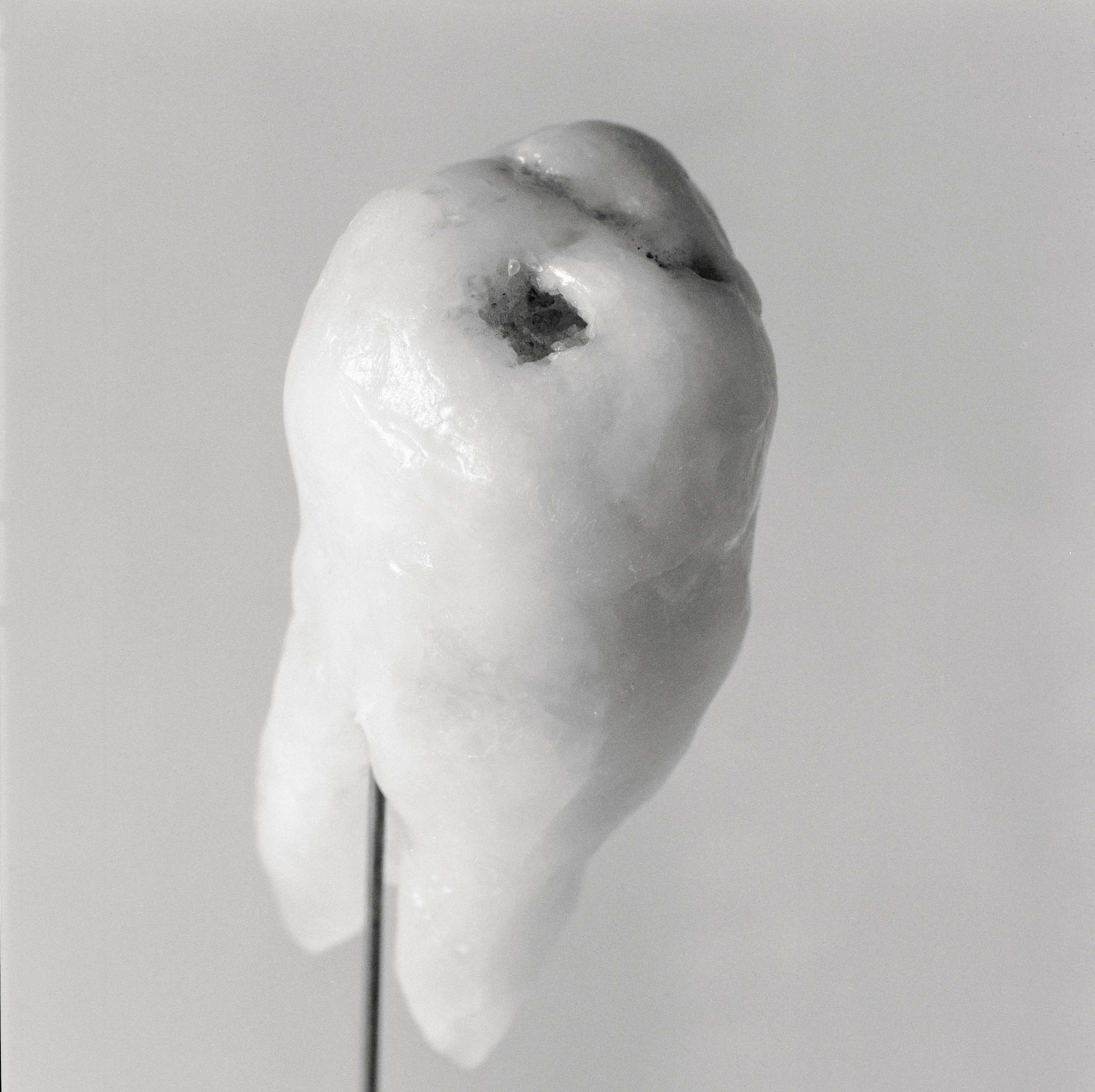 b/n spellicolate e applicate su tela Rembrandt che riprendono particolari ingranditi di minuscole sculture dentali. Solo una delle cinque sculturine, oggetto delle riprese, è proposta in mostra insieme a due fotografie. I denti plasmati quasi interamente in cera - emblematico materiale 'a perdere' - presentano la parte superiore in pietra dura con simulazione di carie antropomorfe le cui corrosioni permettono l'identificazione di faccine patetiche. Ciascuna delle cinque micro-anatomie, protetta da campana in vetro, poggia su una piccola mensola in plexiglas che sporge alla base del telaio.