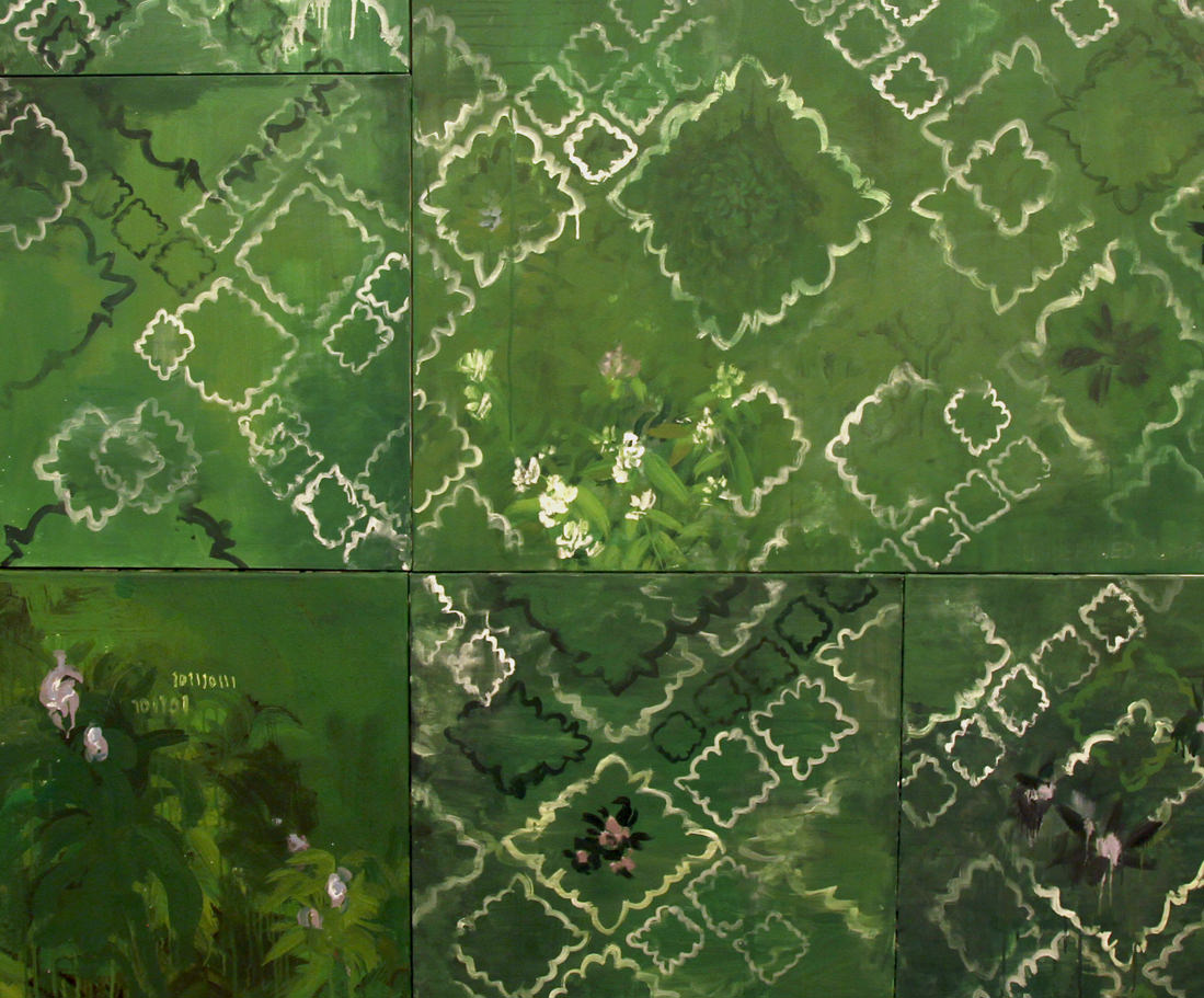 In principio è il giardino ombroso e fiorito che non lascia trapelare nulla sullo sfondo, come per gli impressionisti o per i decoratori di paraventi giapponesi. Una pittura dalla manualità addirittura sospetta, se non si realizzasse che di citazione si tratta: citazione ostentata…