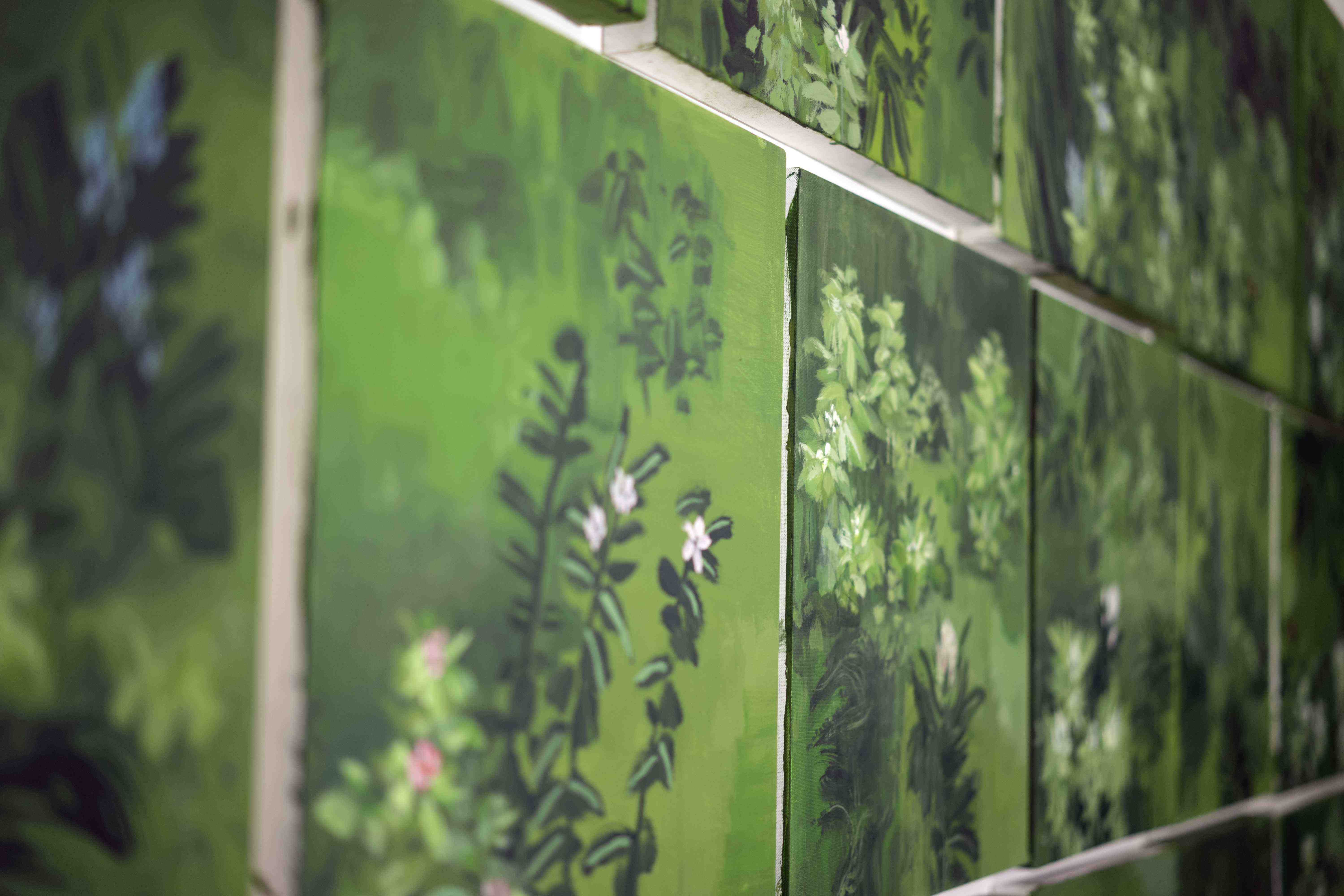 Non aspettatevi una tradizionale esposizione di pittura, una semplice personale di quadri a soggetto botanico, non si tratta qui di “esercizi di stile”, ma di una pittura allegorica e concettuale, dove il dipingere è il medium, lo strumento, la parola. I fiori e le piante rappresentate sugli sfondi di verdi prati altro non sono che dei dettagli di un soggetto più ampio, che non si manifesta nella sua interezza: sono dei particolari di campi da calcio fioriti, o meglio… di campi da calcio abbandonati, friche di periferia.