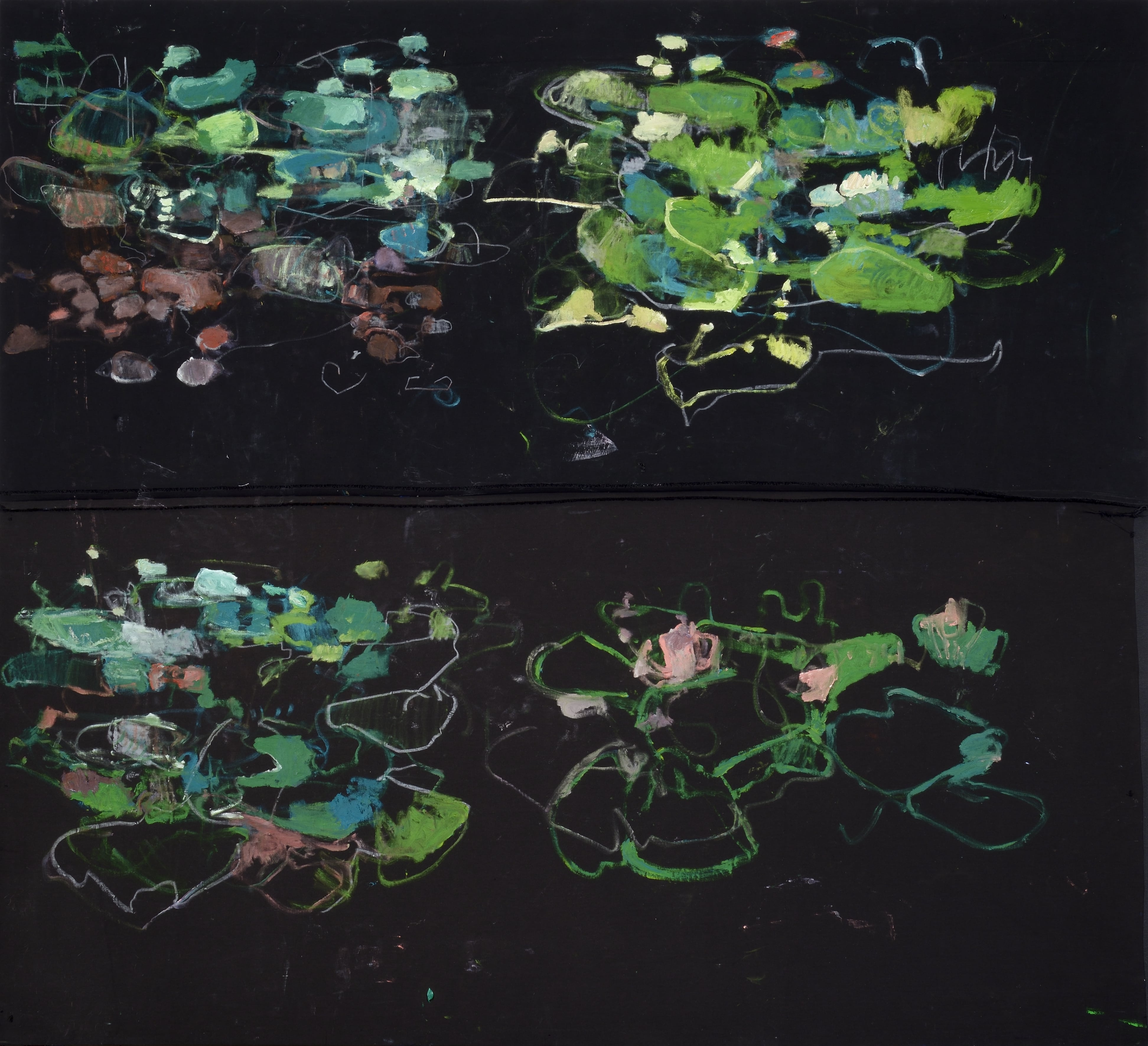 In questa mostra, all’ingresso della galleria, si trovano La vita segreta delle piante, tre piccole sculture realizzate in gesso e resine acriliche, appoggiate a trespoli di legno: con i loro movimenti organici, ricordano forme di vita primordiali. Tutte e tre provengono da Urpflanze, una mostra tenuta l’estate scorsa presso Villa Carlotta di Tremezzo sul Lago di Como. Poi è la volta di Arcipelago, un ciclo di opere ispirate alla costa vicino all’isola Palmaria, vista dal mare. Sono visioni che potrebbero essere quelle di uomini provenienti da mondi lontani e che lì stanno per approdare. La stanza successiva è dedicata ad Ansedonia, immagini di un frammento di un bosco nella pineta dove anche Mario Schifano, un nume tutelare di Frangi, amava passare l’estate. Infine, troviamo le Ninfee, delle opere a cui l’artista ha dedicato molta attenzione negli ultimi tempi. Nella loro realizzazione trova una grande spontaneità, tanto da aver dichiarato di «poterle dipingere anche a occhi bendati». Grandi e piccole, dipinte su fondo nero o su fondo bianco, ma tutte ispirate a immagini scattate all’Orto Botanico di Padova.
