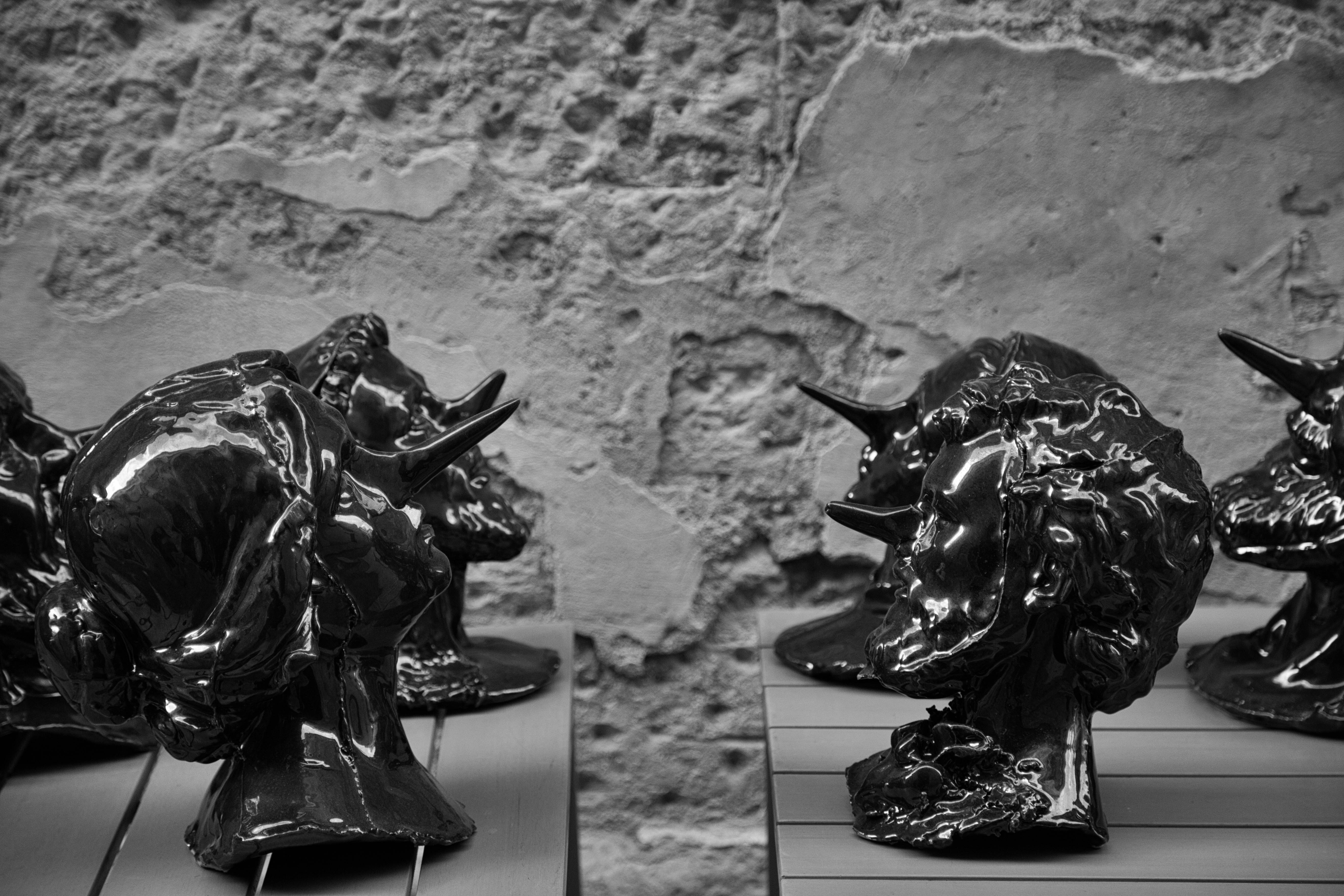 Venti teste come simbolo dell’essenza umana, disposte al centro dello scenario di ‘A tu per tu’, l’opera nata dalla serie ‘Bugie vere, vere bugie’, in cui l’artista evoca un racconto in bilico tra realtà e finzione attraverso un’allegoria delle maschere del quotidiano, servendosi di figure al limite del grottesco ed esaltandone i particolari morfologici nei volti.