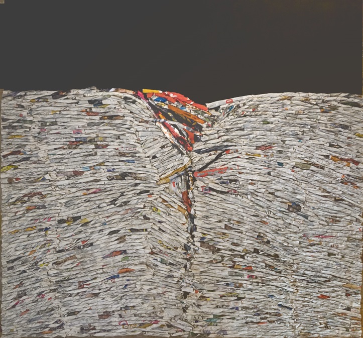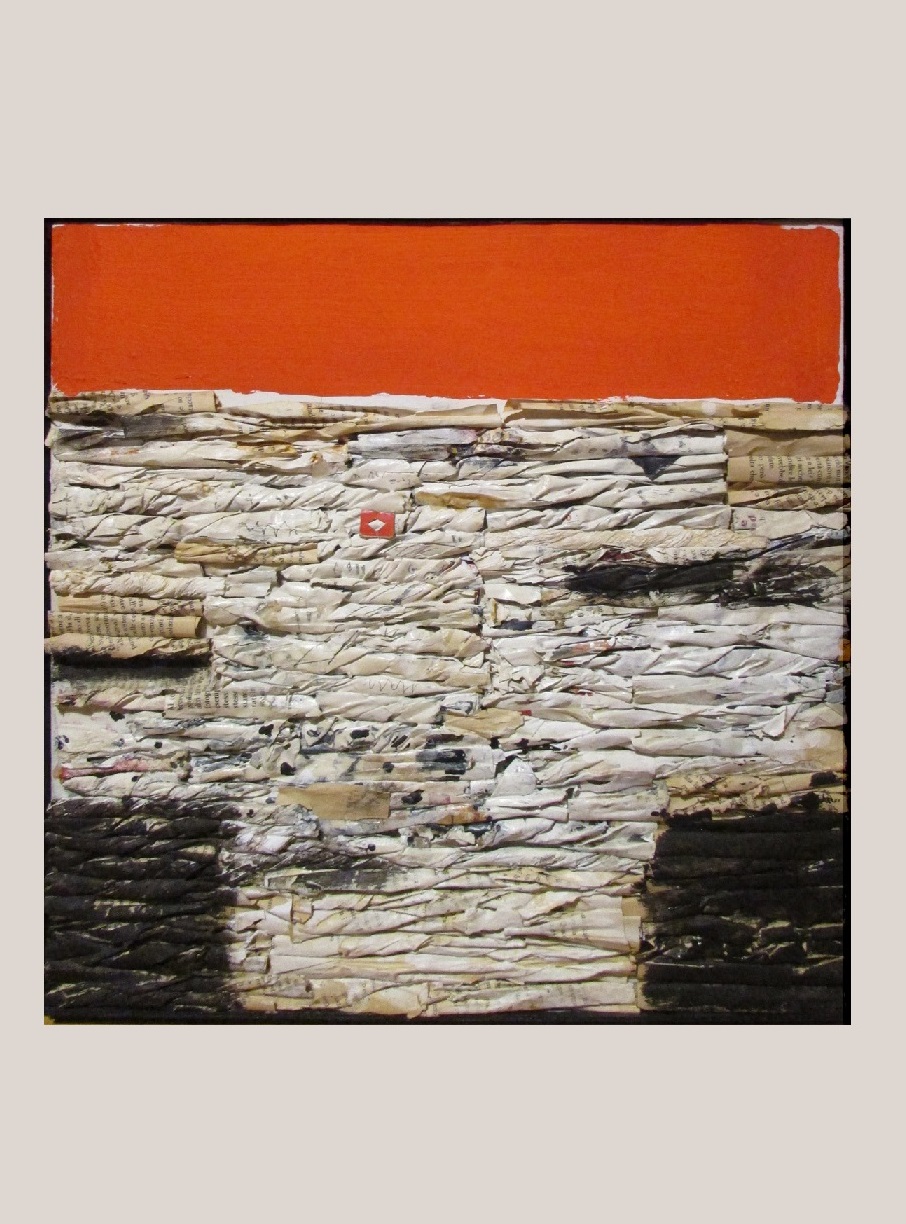 Sono opere costituite da serrate stratificazioni orizzontali improntate da una struttura compositiva raccordata tra essenza e materialità, che negli anni successivi hanno caratterizzato in modo personale la sua ricerca artistica votata all’ossessiva indagine dell’uso dei materiali e verso una rappresentazione volutamente aniconica del linguaggio, ricreata opportunamente utilizzando la carta di giornale stampata arrotolata a mo’ di cordone intrecciato che cela nascosti spiragli di eventi accaduti e storie di esistenze divenute presenze sospese di un procedere assorto al di là di un orizzonte oscuro, incarnando di fatto la tensione imminente dell’energia come essenza dell’essere al mondo.
