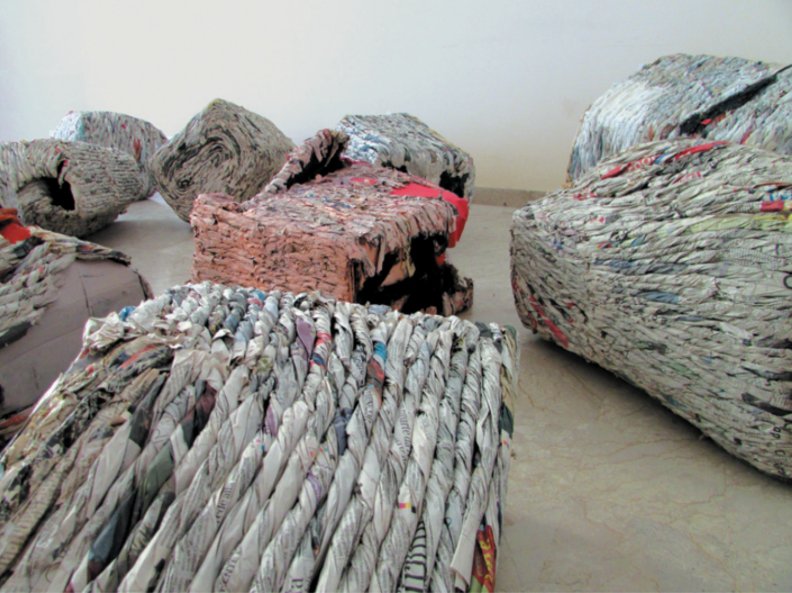 La carta dei giornali è, infatti, la materia principale della sue opere, arrotolata in