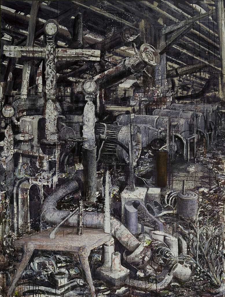 E’ un alternarsi quasi schizofrenico di visioni e procedimenti realizzativi in opposizione, nel pur comune scenario di un’ archeologia industriale che sa evocare storiche ostilità: capitalismo e operaismo, sterilità e produttività, maschile e femminile, “pelle & cuore” e, insieme, sperimentazione e tradizione, bagliori lividi e radiosità solare, spazi claustrofobici e ambienti vertiginosi. La pittura rivela il conflitto interiore dell’artista che nel percorso verso l’armonia deve entrare fino in fondo identità diverse e al momento inconciliabili. Ancora una tappa nel cammino dell’arte.