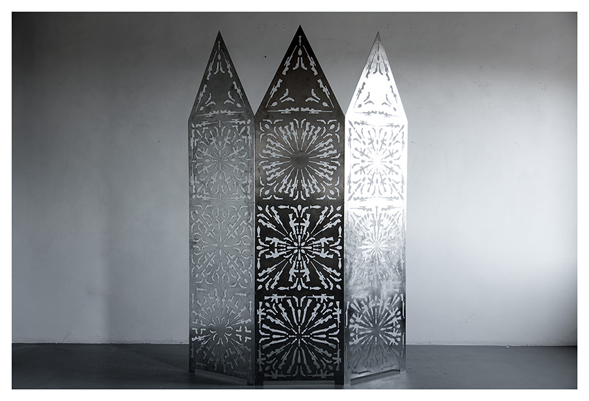 Cosa è il timore? Come figurarlo ai nostri occhi? Ecco comporsi l'idea di una iconostasi materica a separare gli spazi dell'esposizione. Ci vorranno nove mesi di lavoro per definirla e farne un’opera in cui bellezza e paura si fondono: arabeschi di armi che traforano lastre di acciaio inox sagomate come trittici trecenteschi.