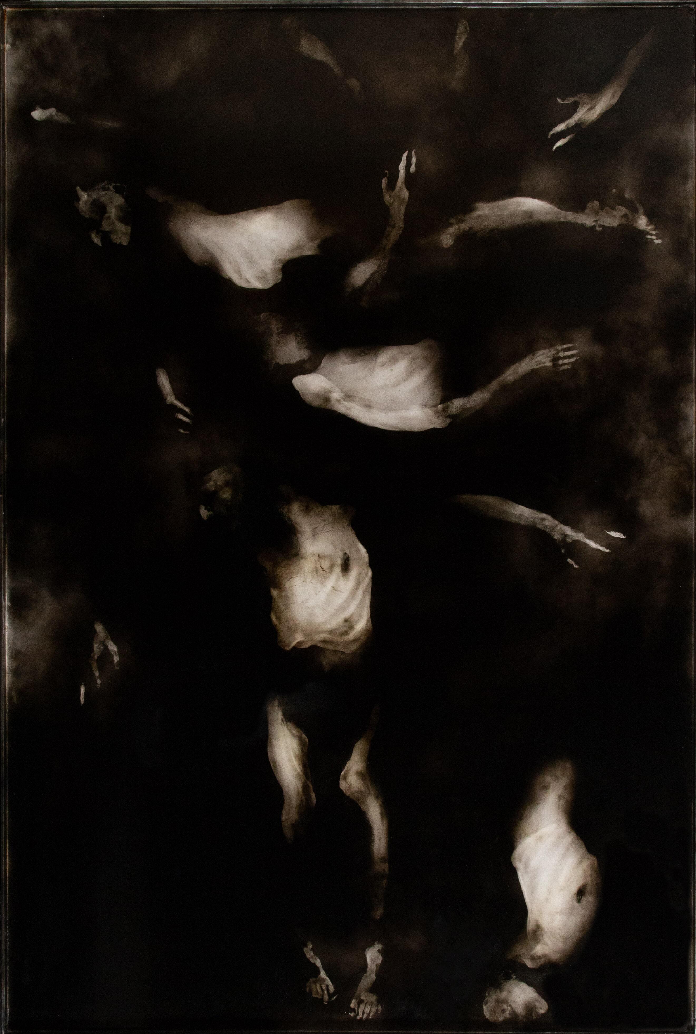 L’arte di Giovanni Manfredini concentra la propria ricerca sul corpo, sulla sua sacralità e sulla luce salvifica e pacificante che ne riscatta la materialità. Unendo performance ed esistenzialismo a espliciti rimandi all’arte sacra, le sue opere nascono dal contatto del suo stesso corpo su una superficie trattata con velature di nerofumo capaci di registrarne il segno. Le parti del corpo si materializzano in modo spettrale dalle tenebre: sono mani, spalle e braccia, gambe, frammenti del torace ad infrangere uno scuro strato del quadro e a rivelarsi in modo luminoso. Il lento lavoro a pittura successivo aumenta ulteriormente la dimensione scultorea delle figure, allontanandole dall’originale espressività performativa. Manfredini lavora da anni sul corpo con una ricerca lenta che ha portato il suo lavoro dai “tentativi di esistenza” del primo periodo ad una affermazione pittorica sempre più consapevole, in cui la luce, pura e assoluta, definisce immagini estatiche e spirituali, che rievocano la pittura del Seicento.
