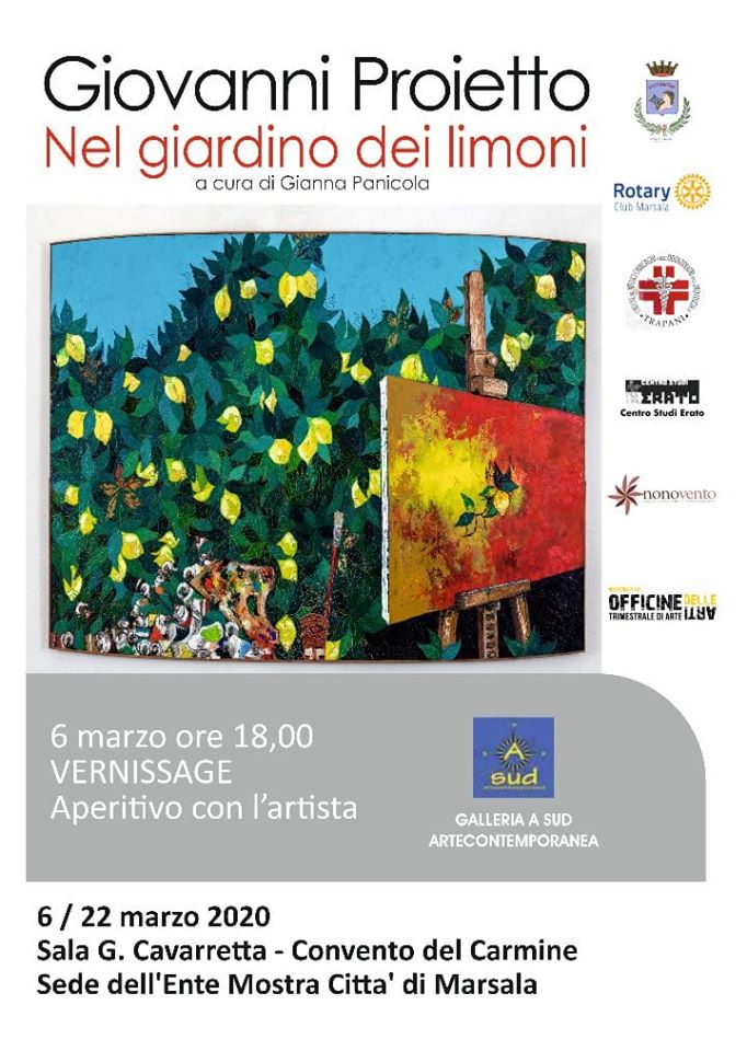 La mostra personale dell’artista Giovanni Proietto dal titolo “Nel giardino dei limoni”, a cura di Gianna Panicola, organizzata e coordinata da Nello Basili, media partner Officine delle Arti di Agrigento, sarà inaugurata venerdì 6 marzo 2020, alle ore 18.00, presso la sala Giovanni Cavarretta del Convento del Carmine, sede dell’Ente Mostra di Pittura Contemporanea Città di Marsala.