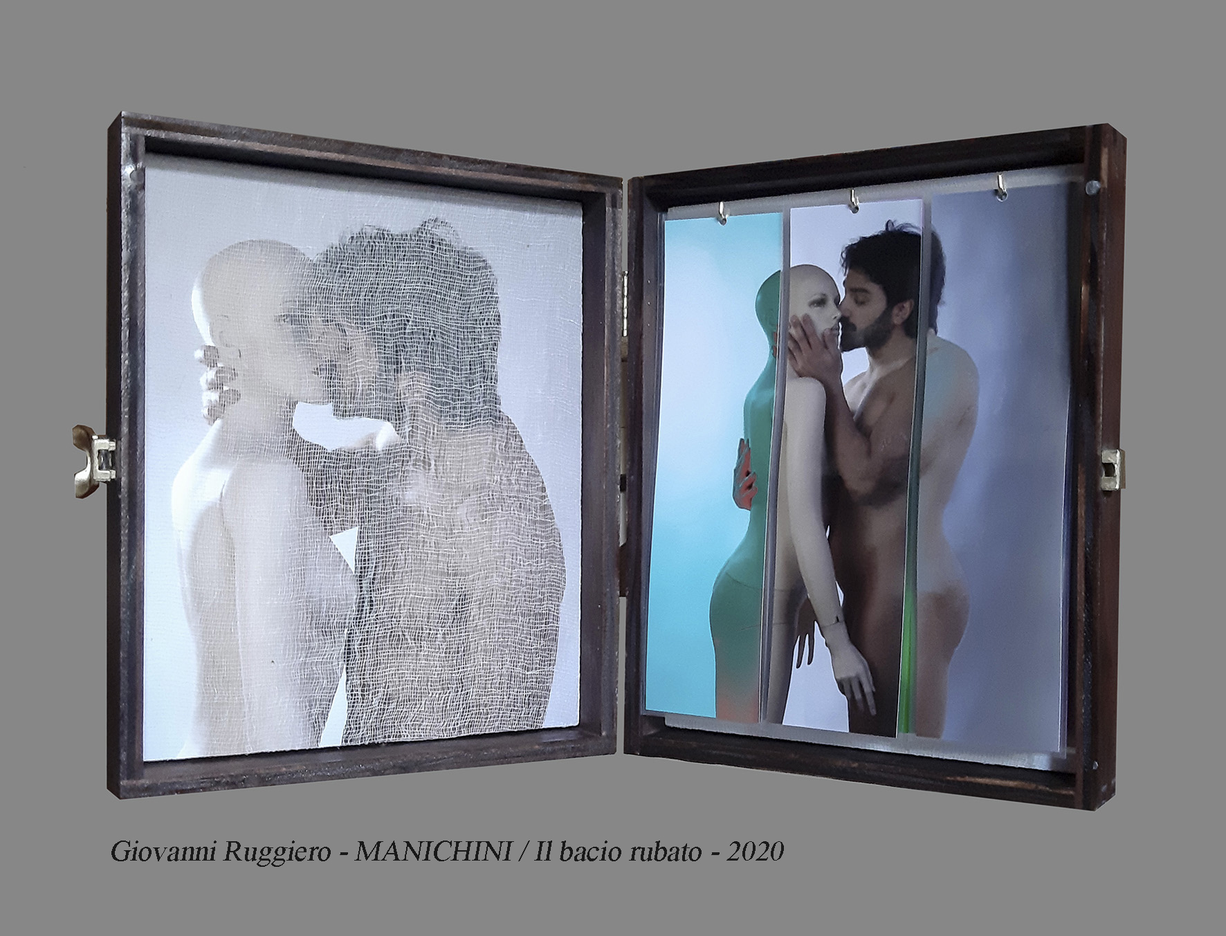 Quale follia, quale disperazione! L’uomo non dice che il manichino sorridesse nella vetrina, sostiene – è convinto – che il manichino sorridesse a lui. Se ne innamora, convinto si essere ricambiato. Va a trovarlo spesso, perché tra saldi, offerte e novità l’inverno era come fosse l’estate e rendeva più folce la sua pena. Si decide, infine, a rompere la vetrina. Il cristallo va giù, e se lo porta a casa. Ci fa l’amore, in luogo delle donne che gli anno sempre sputato addosso dei no. Ho fotografato i manichini per anni, fermandomi sui loro sguardi senza anima. Li amo ma tutto sommato di un manichino non mi fiderei. Soltanto di recente, sono arrivato all’ultima strofa della canzone. E anch’io mi son portato a casa un manichino. Con una serie di scatti, ho realizzato il sogno impossibile ed insensato del protagonista della canzone. Ho assecondato la sua illusione, facendogli credere che il suo amore fosse vero .