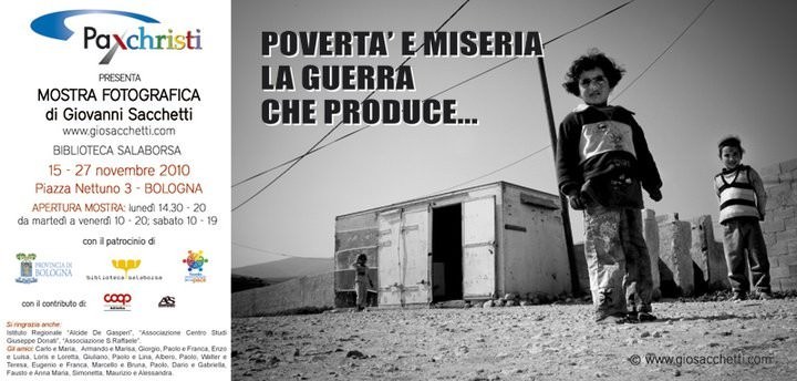 Nell'ambito della manifestazione Segnali di pace, Pax Cristi Punto Pace di Bologna, organizzazione facente parte del Tavolo provinciale per la pace promosso dalla Provincia di Bologna, presenta la mostra fotografica del fotografo Giovanni Sacchetti il quale, con le sue immagini, ci spinge a riflettere sugli effetti e i costi che la guerra produce e le ingenti spese che la medesima richiede. Le immagini, 20 fotografie originali in bianco e nero, provengono da reportage realizzati nei Territori Occupati Palestinesi, Kurdistan-turco ed Iraq.
