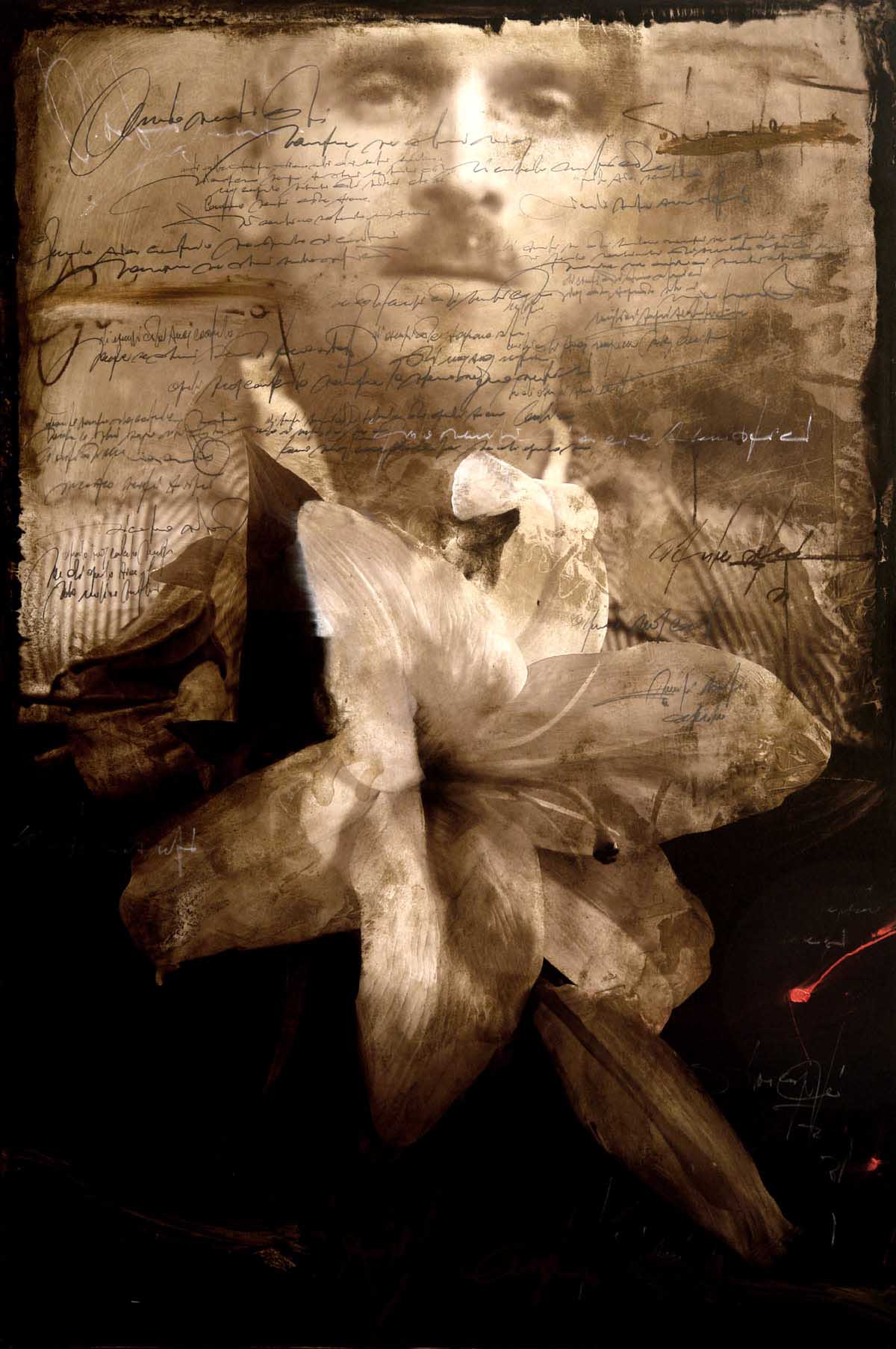 Una volta scelta l’immagine, l’artista inizia il suo lavoro sulla tavola o sulla tela. Le pennellate velano sovente la scena, allo scopo di mettere in rilievo il soggetto principale. Anche il segno è presente, ma sotto forma di indecifrabile grafia. Una scrittura “impressionista”, dove l’unica cosa che si può leggere è la sensazione di parole passate: scritte, lette, recitate.