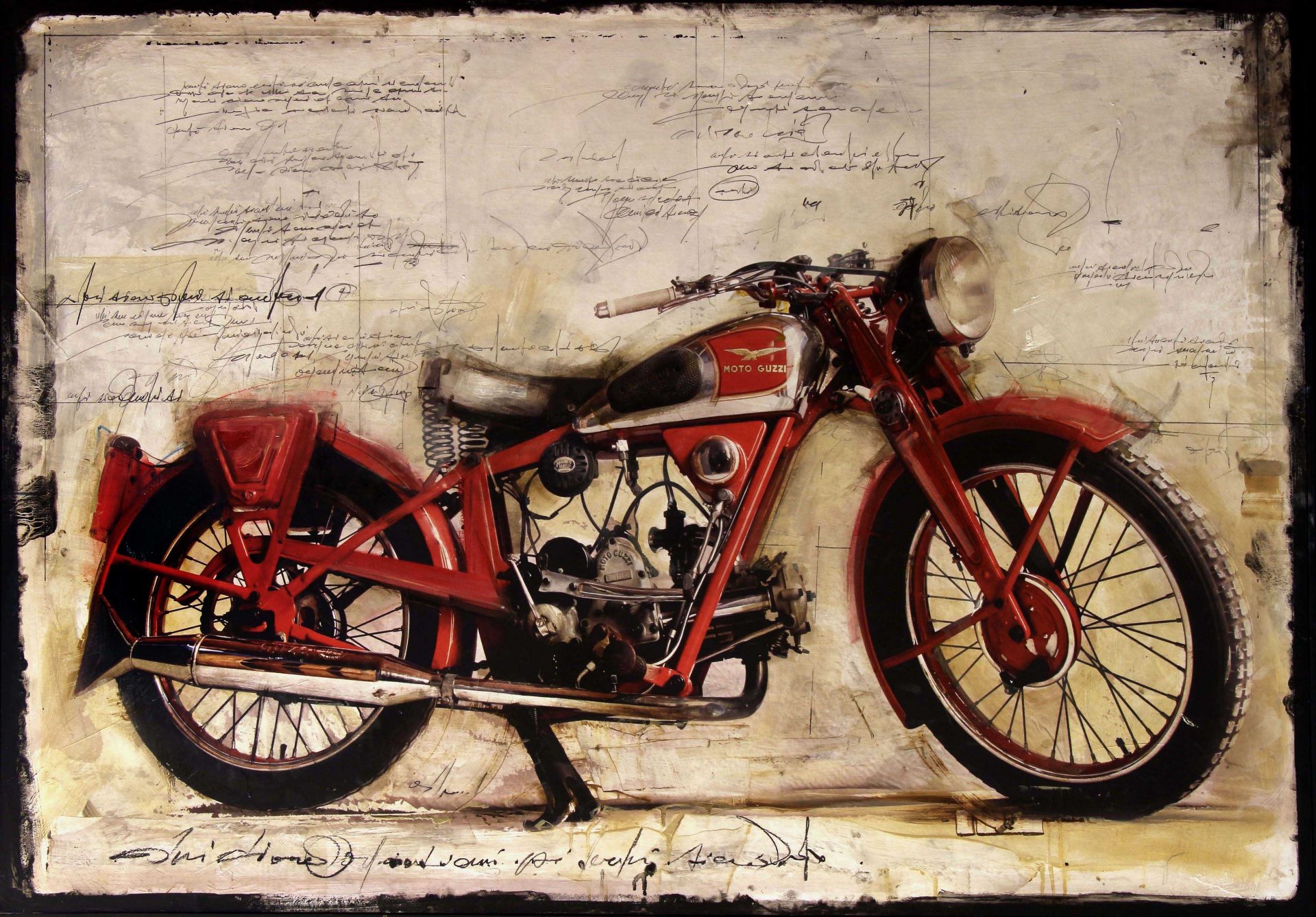Nelle opere in mostra: cimeli, motociclette, volti e oggetti del passato provenienti da fotografie scrupolosamente raccolte da vecchi archivi e mercatini d’antiquariato.