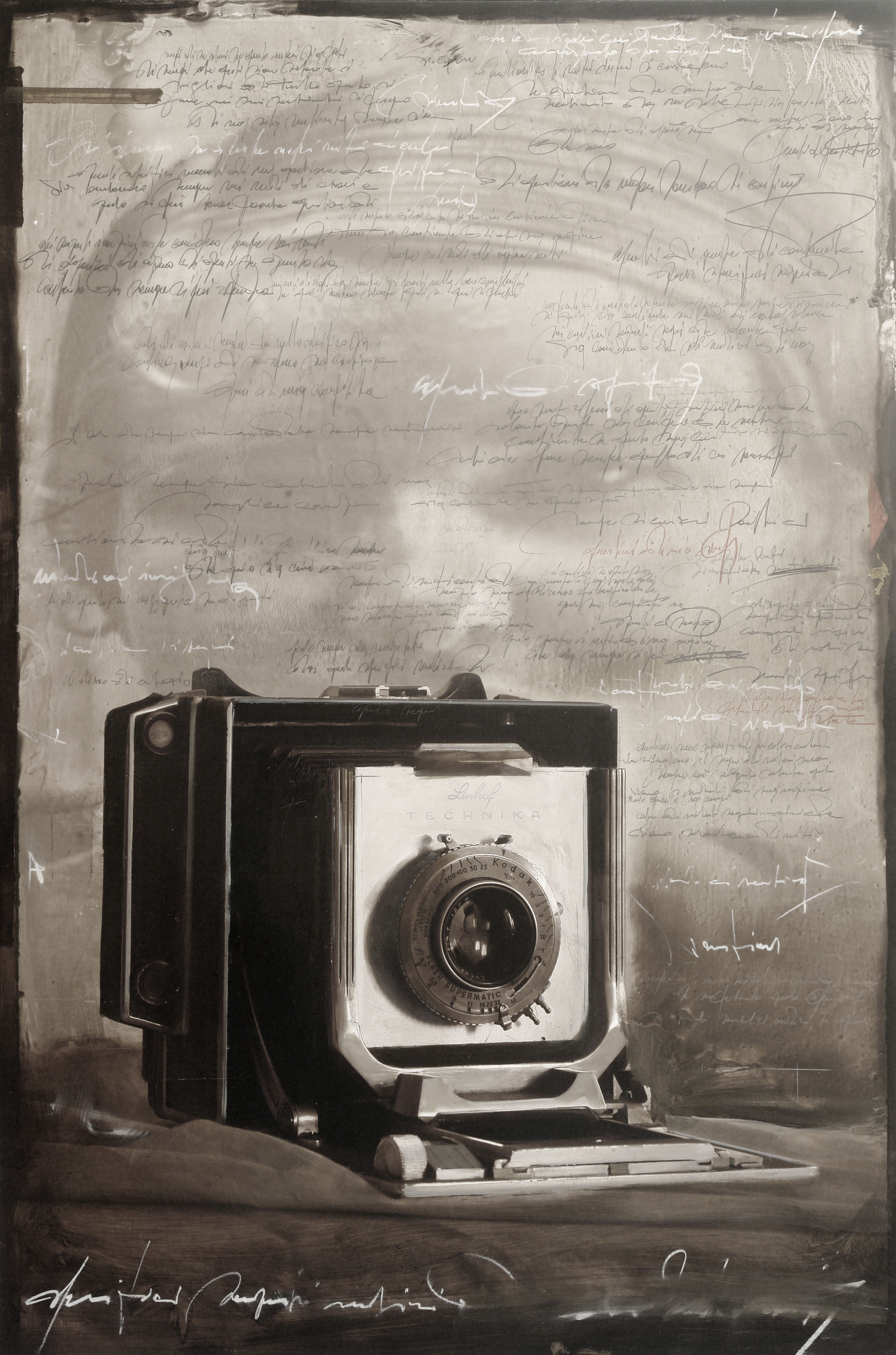Le opere di Sesia nascono da una meticolosa raccolta di cimeli e scatti d'epoca provenienti da vecchi archivi e mercatini d’antiquariato. I volti, gli oggetti, le sedie in particolare, ma anche motociclette, fotocamere, giocattoli, sculture, elementi naturali diventano il punto di partenza per l’intervento dell’artista, la cui tecnica fonde fotografia, pittura e segno grafico: pennellate materiche velano la scena per far emergere il protagonista, mentre una scrittura densa e indecifrabile attraversa la tela o la tavola. Non si tratta di una narrazione esplicita, ma della traccia visibile di riflessioni condivise, ricordi annotati ed emozioni rese visibili.