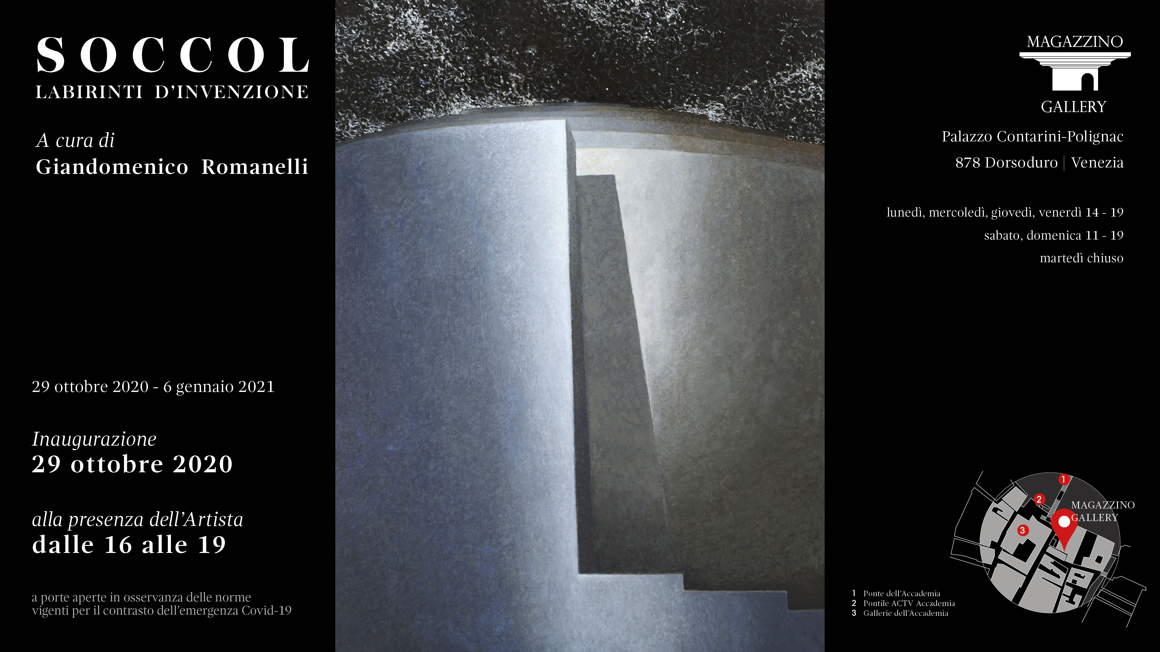 Il 29 ottobre 2020 si inaugura a Venezia la mostra di Giovanni Soccol, Labirinti d’invenzione, allestita negli spazi del Magazzino Gallery, all’interno del quattrocentesco Palazzo Contarini Polignac, prospiciente il Canal Grande. Con la sua straordinaria facciata lombardesca, è uno dei più interessanti e pregevoli palazzi veneziani da un punto di vista architettonico e storico che divenne, con la principessa Winnaretta Singer Polignac, all’inizio del secolo scorso, punto di riferimento e d’incontro di personalità di straordinario livello culturale da Igor Stravinsky a Marcel Proust, John Sirgent Sargent, Ezdra Pound, Diaghilev, Picasso…