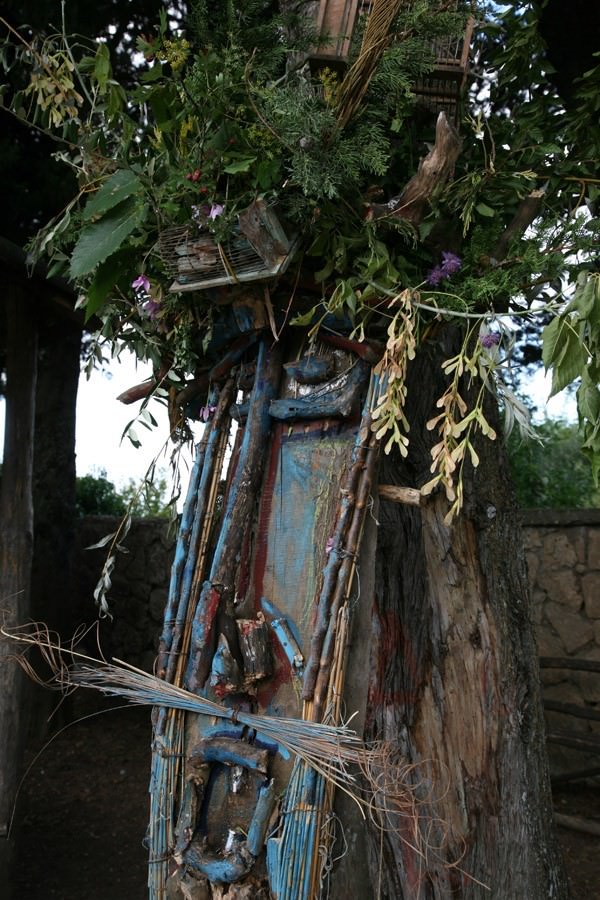 “Sabato 18 settembre, sulla Collina dell’Angelo si pregano i signori bambini di venire accompagnati dai genitori in occasione della trasformazione dell’Albero Vagabondo in Metamorfo”. Le scuole elementari e medie di Santo Stefano del Sole accoglieranno con questo invito le famiglie del piccolo Comune nel Parco Regionale dei Monti Picentini. I bambini, insieme alla metamorfoggettografia di Giovanni Spiniello, saliranno ancora e di nuovo sulla Collina dell’Angelo e da lì si muoveranno per verificare se è stata pulita la montagna invitando i più grandi a salire con loro per finire il lavoro. Quest’anno, infatti, dopo la Festa del Colore del 10 giugno, c’è stata una sparuta ma significativa giornata ecologica il 5 settembre (Puliamo la montagna) ed è stato pulito un pezzetto di bosco permettendo all’Associazione culturale AGS di completare per il secondo anno il ciclo della favola dello Spirito del Re Albero. Non in tutte le tappe e tutti gli anni è possibile tornare con il Metamorfo, visto che “mentre l’Albero vagabondo” afferma Giovanni Spiniello “era una provocazione, un urlo di protesta nato per, da e con i rifiuti che i cittadini abbandonano, l’Albero Metamorfo, invece, vuole essere un messaggio di speranza dopo l’azione degli abitanti stimolati dai bambini. Il Metamorfo ha lo sguardo di un uomo venuto dal neolitico, un essere primitivo che si guarda intorno e si costruisce da solo con gli elementi della natura: rami di pino e di ulivo per capelli, vimini, nidi di rondine abbandonati per cappello, radici di edera sradicate dalla neve sono il suo corpo, tavole di castagno il busto, frutti di passiflora gli tengono compagnia e pigmenti naturali a colorargli occhi, naso e bocca”.