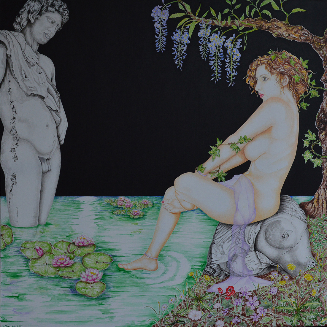 “la scena idilliaca – osserva l' artista - mi avvolge ed assorbe, la luce esplode verso di me ed in me, i colori si accendono, l’acqua lentamente scorre e risuona. Le giovani ninfe si animano, Diana mi sovrasta dall’alto, i dardi volano sibilando striscianti nell’aria, il verde cupo della vegetazione nasconde e svela occhi indiscreti, a momenti si avverte il duro latrare di cagne. Io osservo e mi sento osservato, si quasi deriso, da Te, splendida giovane ninfa che sorridi intrigante, e solo Tu, fra tutte, ci guardi per sempre e a noi ti mostri in eterno, abbagliante, immersa nell’acqua”.