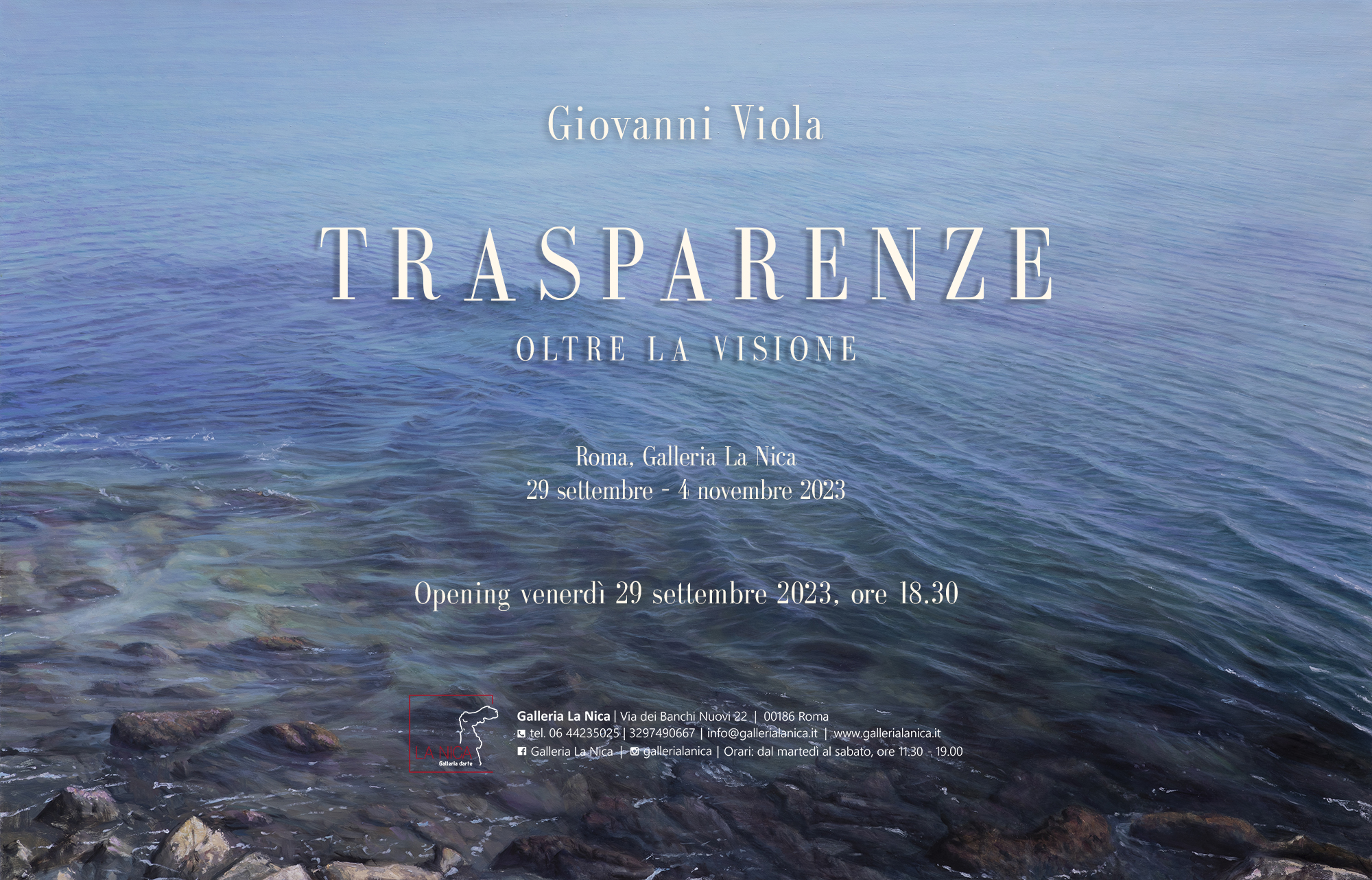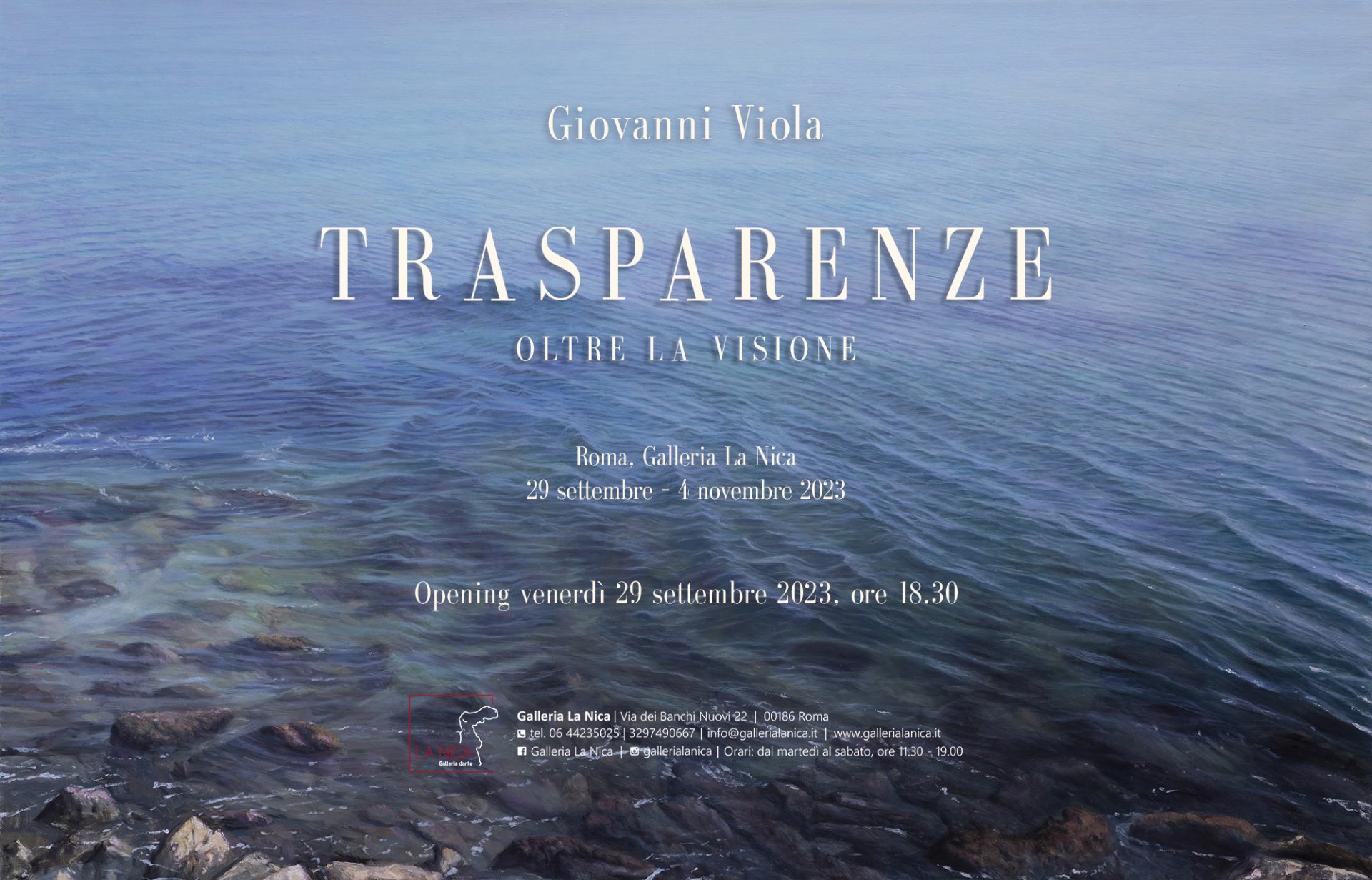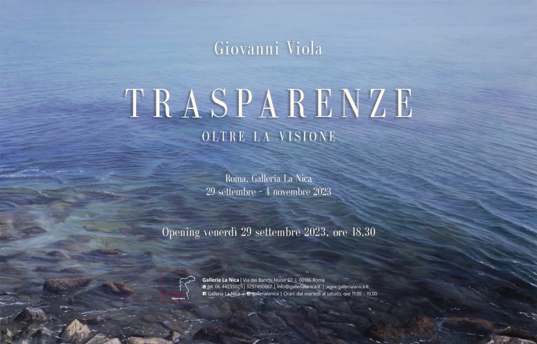 Venerdì 29 settembre 2023 alle ore 18.30 verrà inaugurata alla Galleria La Nica di Roma, sita in via dei Banchi Nuovi 22, "Trasparenze – Oltre la visione", prima personale romana dell’artista siciliano Giovanni Viola, che prenderà parte all’ottava edizione della Rome Art Week, la settimana dell’arte contemporanea della Capitale.