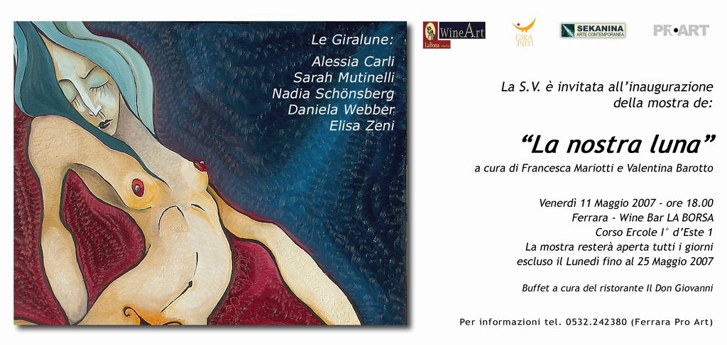 Venerdì 11 MAGGIO 2007, alle ore 18:00, l’Associazione Culturale Ferrara Pro Art inaugurerà la mostra delle artiste ALESSIA CARLI, SARAH MUTINELLI, NADIA SCHONSBERG, DANIELA WEBBER ED ELISA ZENI, fanno parte del gruppo artistico GIRALUNE. La mostra si protrarrà fino al 25 MAGGIO 2007.