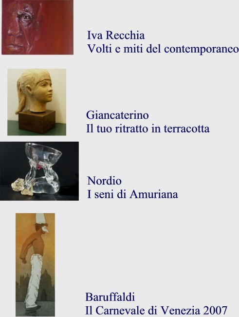 La manifestazione apre i battenti sabato 10 febbraio con la Vernice allestita nella galleria veneziana a Dorsoduro 862 (Campo San Vio) alle 17.30. E proseguirà per l'intero mese di febbraio. Si tratta di 4 originalissime "vetrine d'artista" dove troverà spazio la performance dello scultore Antonio Giancaterino che, in trenta minuti, realizzerà il ritratto a chiunque vorrà proporsi a sorpresa come modello. Accattivanti e sensuali sono certamente i "seni di Amuriana" di Massimo Nordio, originalissime sculture in vetro . A sorpresa i ritratti di Iva Recchia (Riva), da Dario Fo al cardinale Ruini. Non poteva poi mancare l'audace Pulcinella di Paolo Baruffaldi che questa volta pare quasi prendere il volo, scrollandosi di dosso la vecchia casacca e con essa tutto ciò che lo "imprigionava" ancora nella Commedia dell'arte.