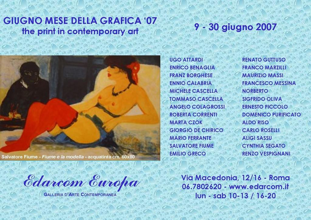 Dal 9 al 30 giugno 2007 la galleria d’arte contemporanea Edarcom Europa ospiterà presso i propri spazi di via Macedonia, 12/16 la seconda edizione della rassegna “Giugno, mese della grafica: the print in contemporary art”.