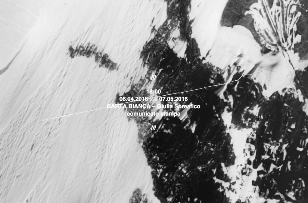 Il 6 aprile 2016 t-space inaugura il suo programma espositivo con Carta bianca, prima personale di Giulia Spreafico, a cura di Elena D’Angelo. In mostra tre cicli di lavori rappresentativi di una ricerca durata due anni e concentrata sulle esplorazioni dei ghiacci Antartici, sfide autoimposte al fine di raggiungere luoghi distinguibili solo grazie ad un calcolo matematico
