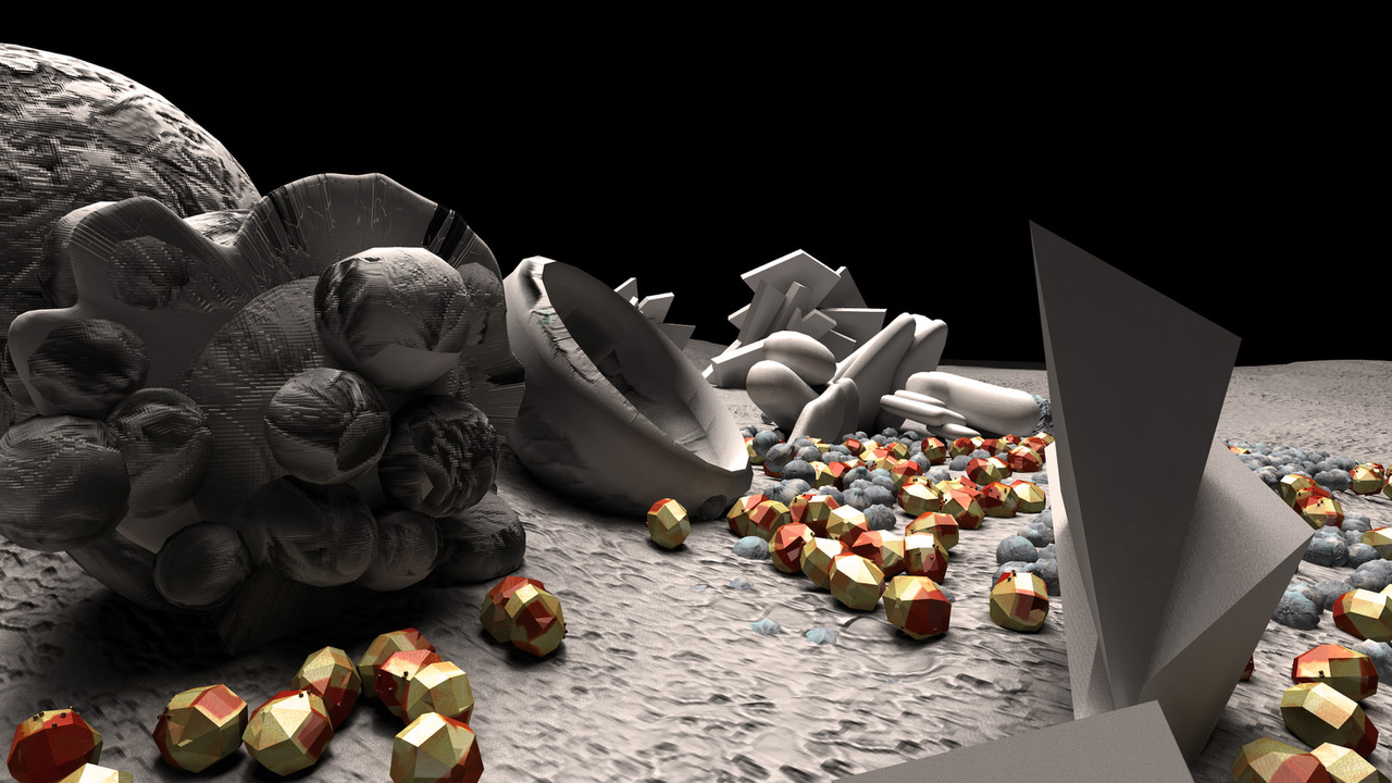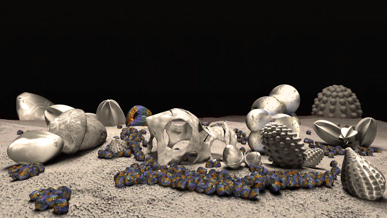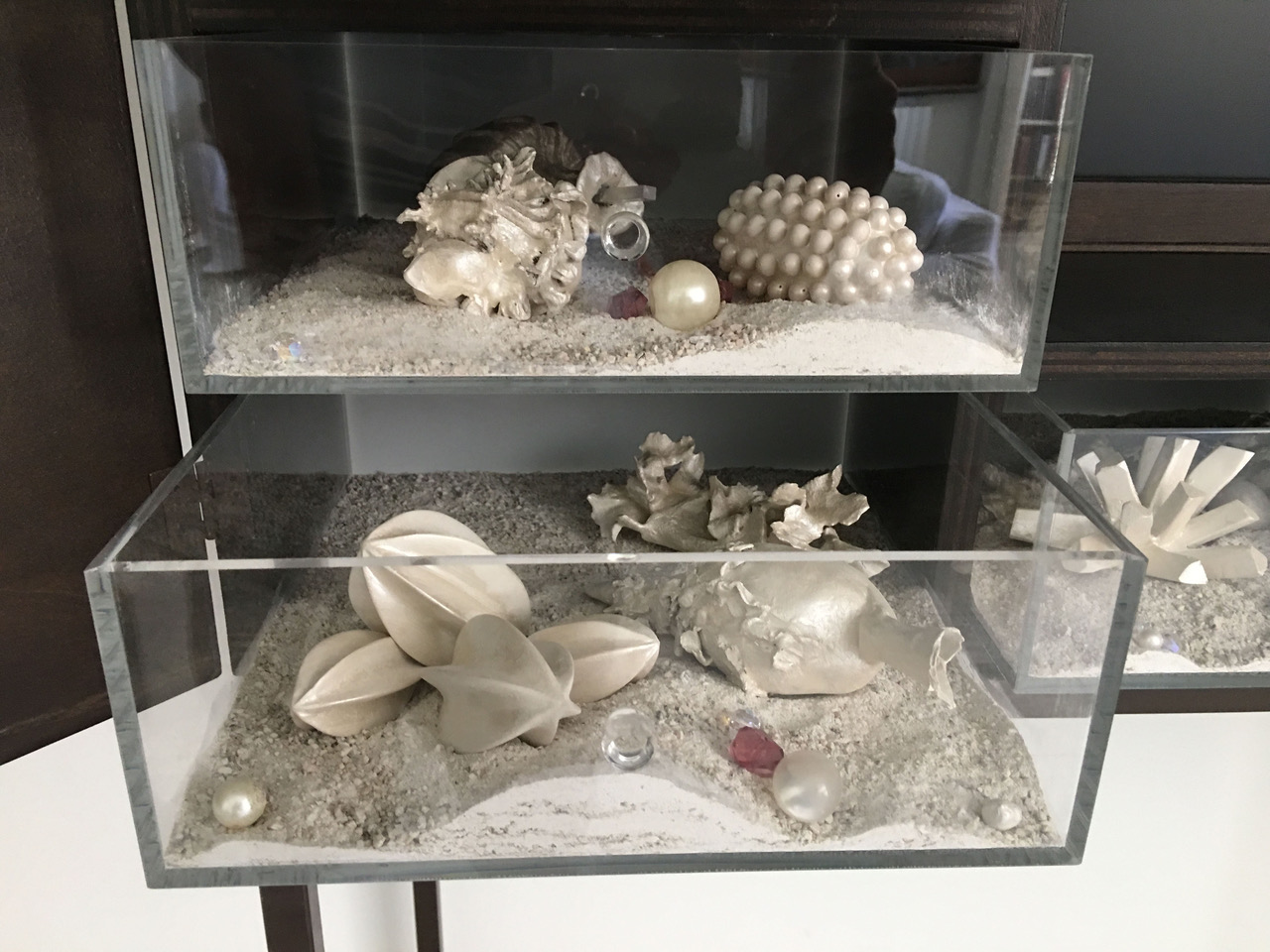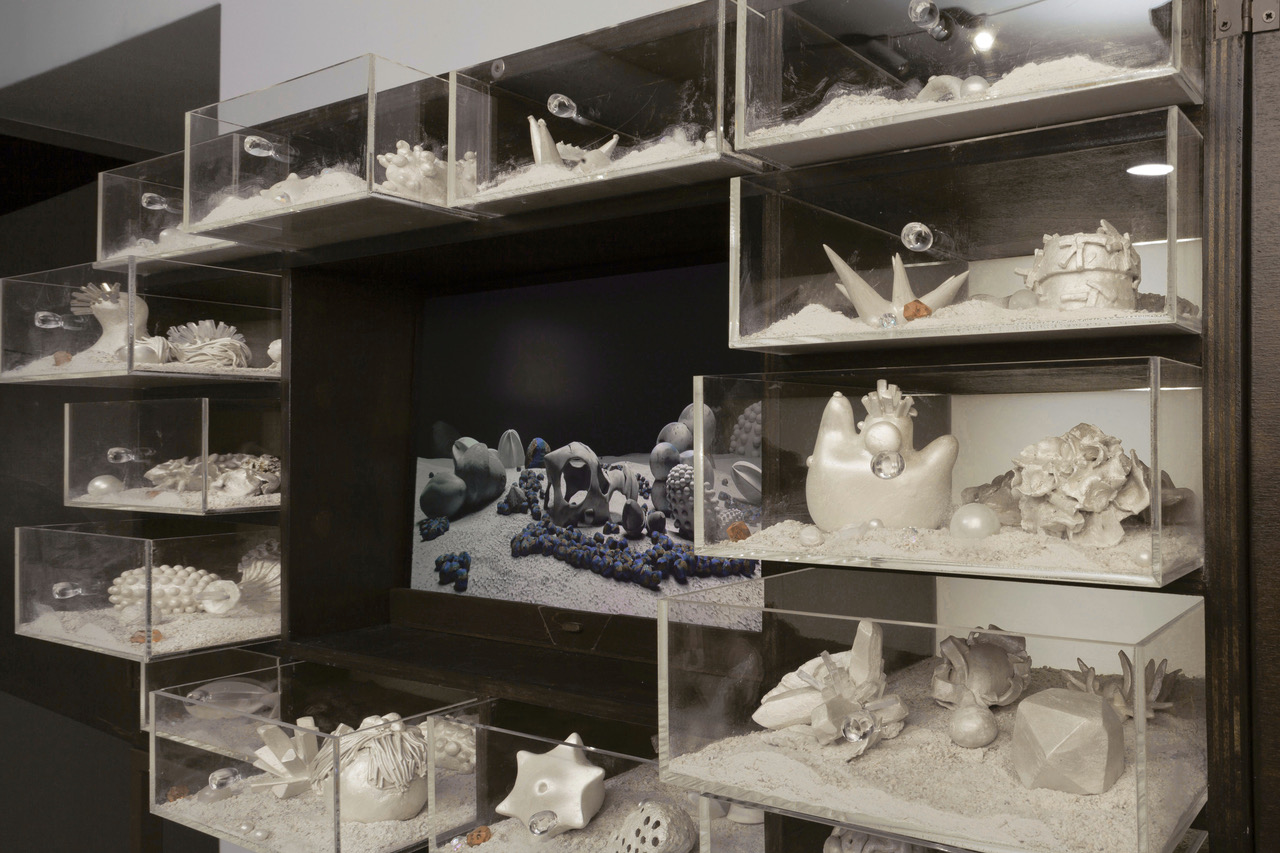 Matter Waves Unseen può essere letta come una vera e propria ‘camera delle meraviglie’ interpretata in chiave contemporanea. L’artista riprende la tradizione delle “wunderkammer”, raccolte di antichità e oggetti singolari, inserendo in uno stipo da collezionista piccole sculture di argilla dipinte (circa 50) in madreperla. Tra i cassetti è posizionato uno schermo al plasma nel quale scorrono le immagini realizzate con la tecnica dell’animazione 3D che mostrano onde di terra che, nel loro flusso, portano alla luce oggetti dalle forme differenti che poi vengono nuovamente inghiottiti in un processo magnetico di apparizione e sparizione. Questi elementi provenienti dal nanomondo sembrano depositarsi come forme germinali all’interno dei cassetti in una progressiva interazione che permette di scrutare l'aspetto profondo e misterioso della materia.