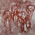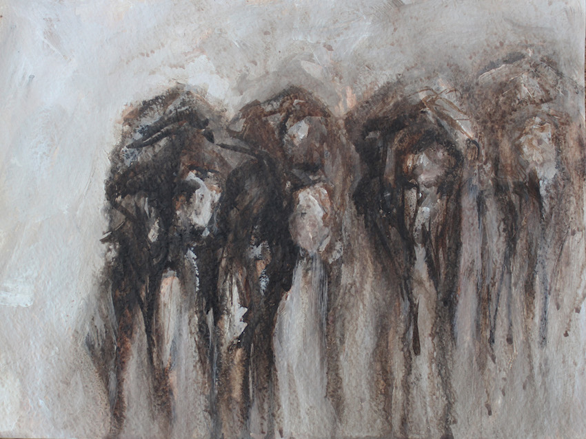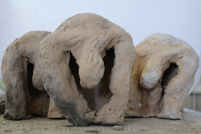 Battiti è l’immagine di una figura ripiegata su ste stessa: forse lontana, immersa in una realtà altra, cerca nel suo intimo energia e una nuova coscienza, e costruisce una diversa configurazione fisica e spirituale che trae in sé e nel possibile sguardo verso l’altro potenza vivificatrice e generatrice. Dentro l’involucro crudo e misterioso scorrono battiti, colpi sordi di negata vita che trascendono verso mondi di valore e dignità e che si materializzano attraverso diversi codici linguistici e attraverso varie tecniche – pittoriche, scultoree, installazioni e video. Un ciclo di opere pittoriche, di bozzetti e di studi evidenziano capacità descrittiva e visionaria ed un uso poetico dei colori e preannunciano la figurazione di una scultura in terra, sabbia e paglia, materiali primordiali che profumano di essenze ancestrali e raccontano di lotte interiori, di nascondimenti e salvezze. L’esercito di figurine in terracotta, simili tra loro, disposte nella stessa fissata posizione nel corpo e nello spazio, definiscono dimensioni relazionali oggettive e soggettive, delineando attività, risorse e strumenti e lo stesso agire dell’uomo che conduce ad un percorso di liberazione. In mostra anche un’installazione realizzata con tralci di vite, metafora della fatica del lavoro e delle relazioni umane, memoria di un passato e prefigurazione di un futuro, di un nuovo umanesimo che emerge da una struttura intricata e convulsa. Completa il progetto un video, dove suoni ripetitivi e meccanici accompagnano immagini astratte, ruotanti e vibranti e dalle quali emerge una vena pulsante, vita ciclica che si rinnova ogni giorno.